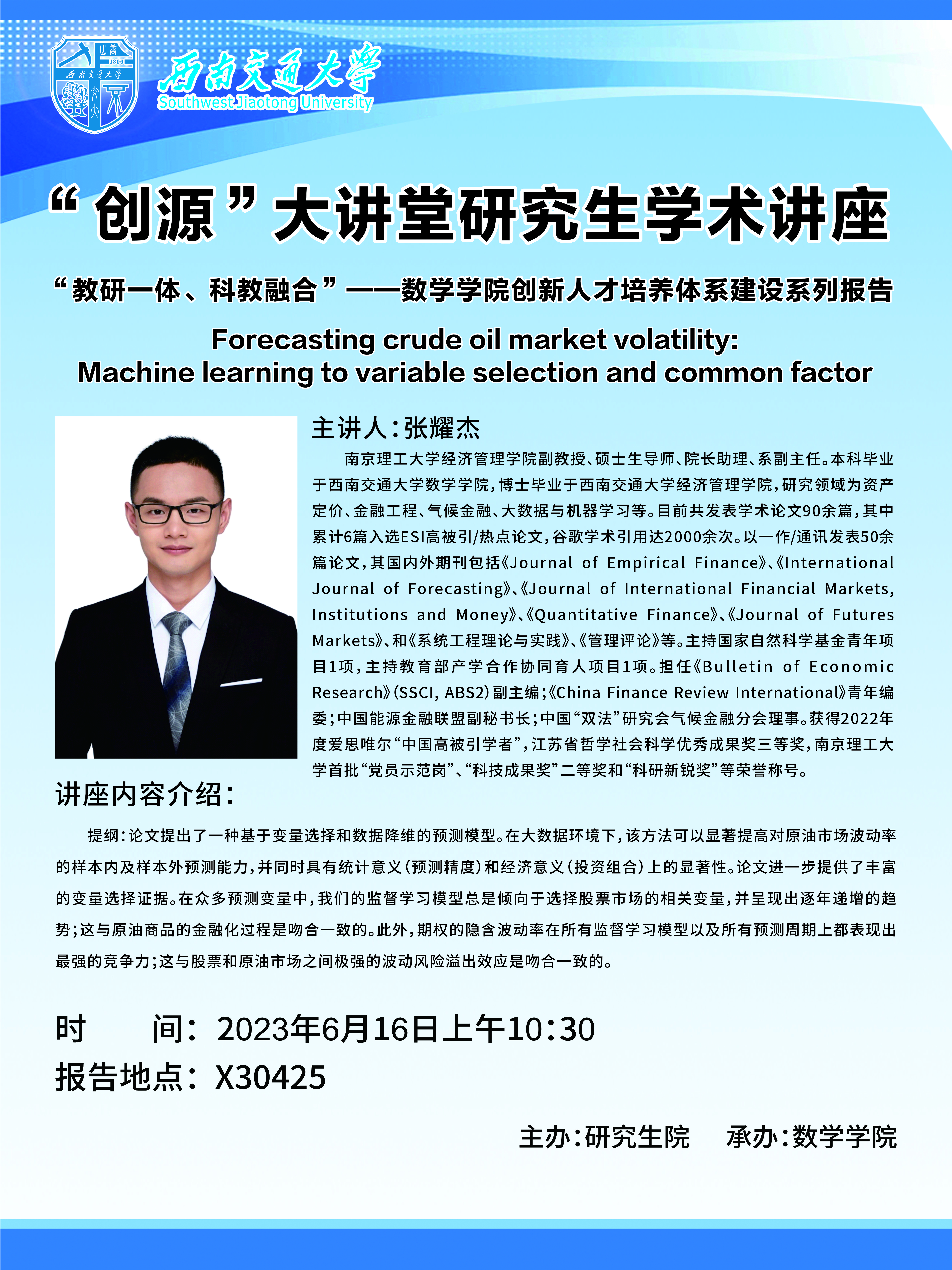 报告人简介:张耀杰,南京理工大学经济管理公司副教授、硕士生导师、经理助理、系副主任。本科毕业于太阳集团tcy8722,博士毕业于太阳集团tcy8722经济管理公司,研究领域为资产定价、金融工程、气候金融、大数据与机器学习等。目前共发表学术论文90余篇,其中累计6篇入选ESI高被引/热点论文,谷歌学术引用达2000余次。以一作/通讯发表50余篇论文,其国内外期刊包括《Journal of Empirical Finance》、《International Journal of Forecasting》、《Journal of International Financial Markets, Institutions and Money》、《Quantitative Finance》、《Journal of Futures Markets》、和《系统工程理论与实践》、《管理评论》等。主持国家自然科学基金青年项目1项,主持教育部产学合作协同育人项目1项。担任《Bulletin of Economic Research》(SSCI, ABS2)副主编;《China Finance Review International》青年编委;中国能源金融联盟副秘书长;中国“双法”研究会气候金融分会理事。获得2022年度爱思唯尔“中国高被引学者”,江苏省哲学社会科学优秀成果奖三等奖,南京理工大学首批“党员示范岗”、“科技成果奖”二等奖和“科研新锐奖”等荣誉称号。