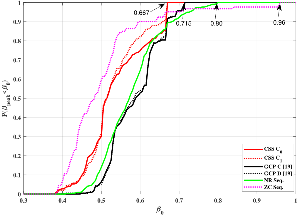 图2:新提出的基序列集与以往基序列集的时域峰值互相关比较(CSS为本文所提)