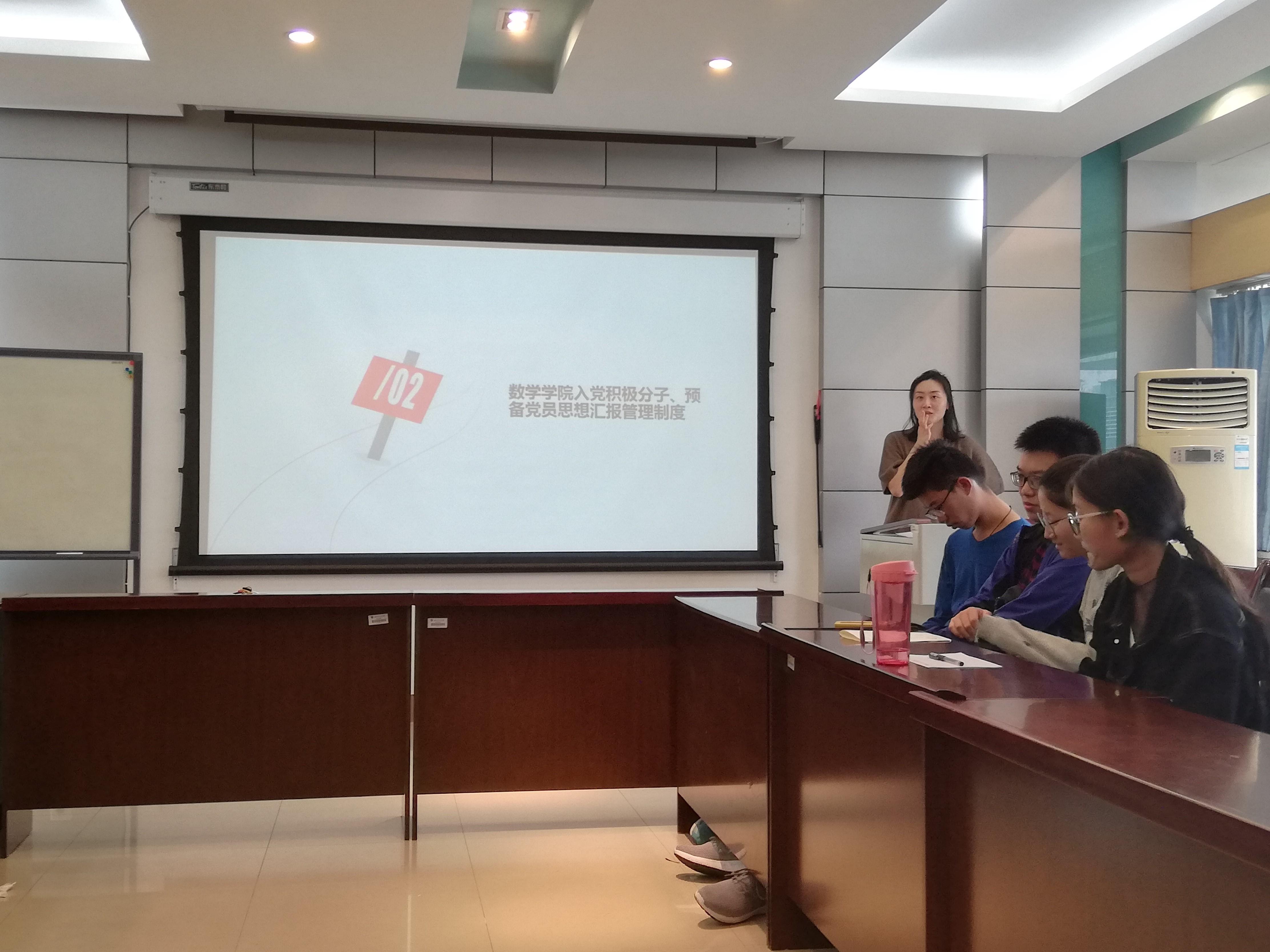 十月十二日下午一点太阳集团tcy8722在X2511召开支部会议暨积极分子培训大会,该会议由太阳集团tcy8722学工办主任兼员工党建指导老师卢怡帆老师主持,出席本次会议的有应数专业党支部书记孙昊,统计专业党支部书记张雁灵以及各班团支书和入党积极分子人员。