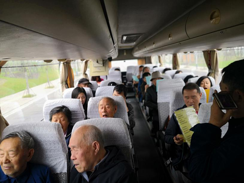 利用坐车时间,支部宣传委员组织大家颂唱“我和我的祖国”,每一位老同志都通过歌声传达着自己对党和祖国的深情和激情。