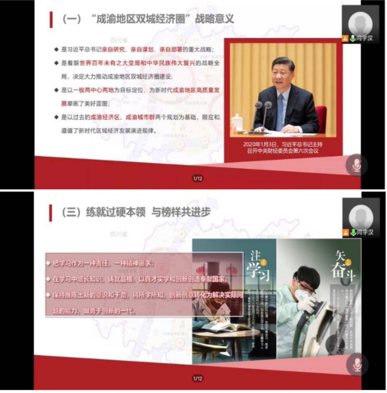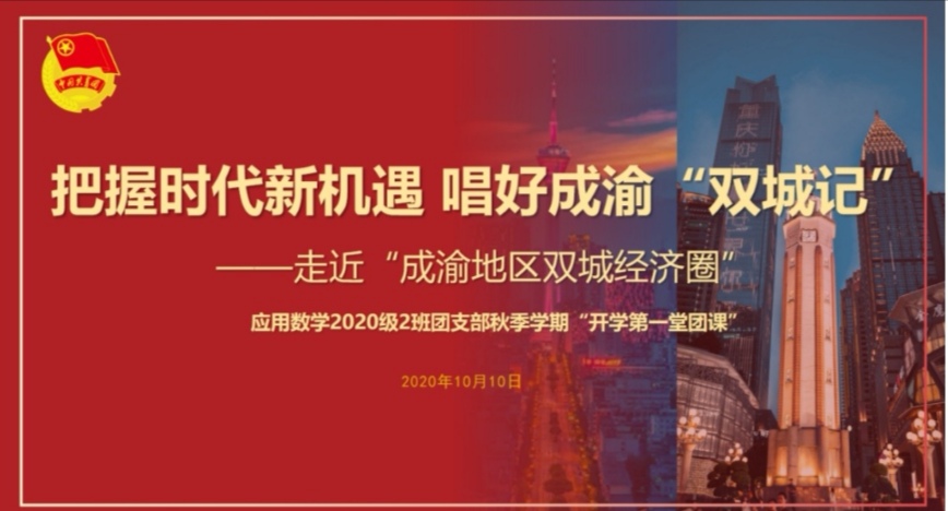 为深入学习“成渝地区双城经济圈”、“交通强国”等国家战略,引导支部共青团员将个人成长融入国家发展大局,担当时代责任、勇于砥砺奋斗、练就过硬本领,并响应公司团委秋季学期“开学第一堂团课”的号召。应用数学2020级2班团支部于10月10日15:00以视频会议的形式,开展了“带你走近‘成渝地区双城经济圈’”主题团课。本次团课由团支部书记闫宇汉主持,支部28名团员按时参加。