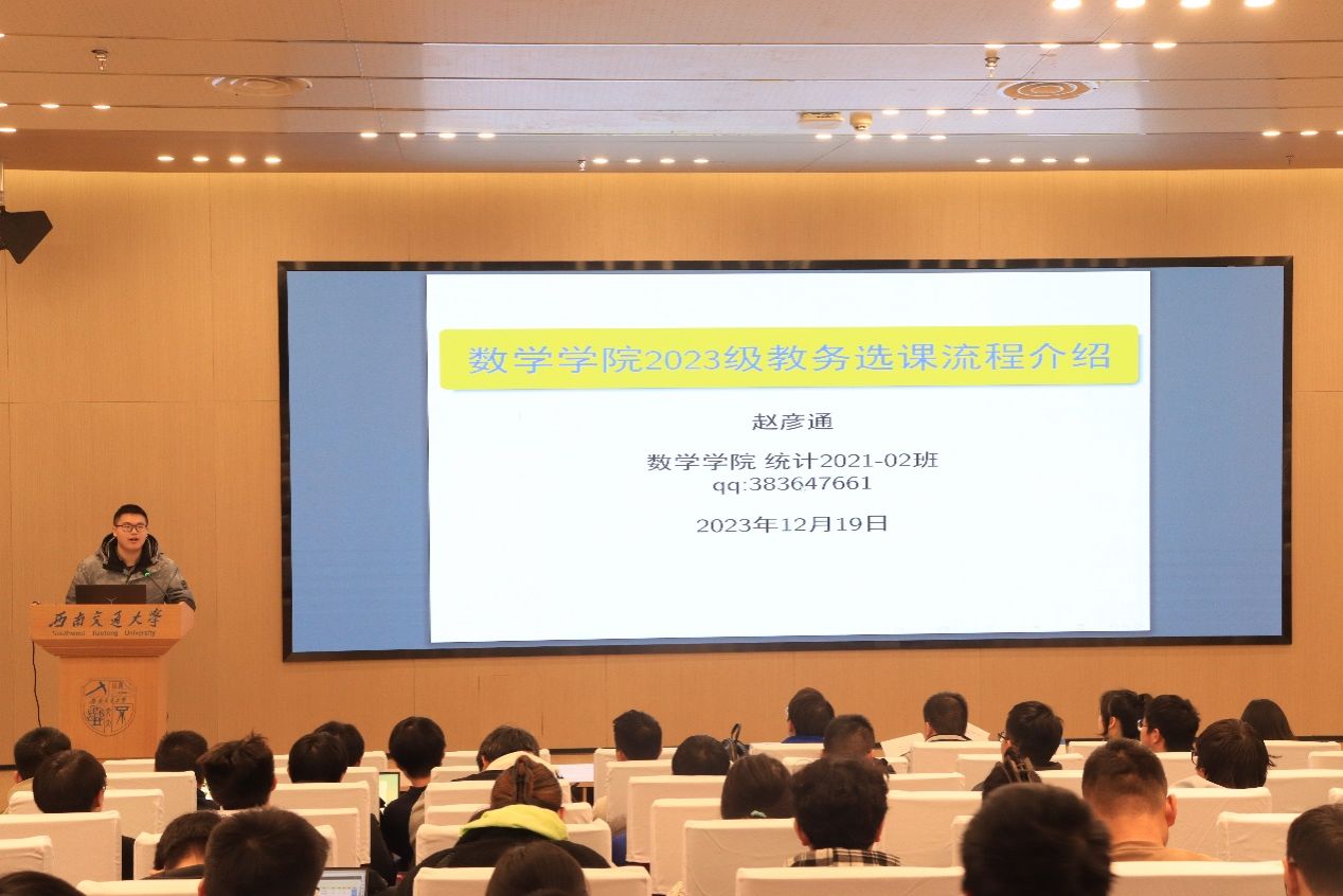 接下来,党员代表、优秀学长代表赵彦通同学为2023级本科生作选课流程介绍,针对新生提出的选课方面的问题做出详细的介绍,并进行演示讲解。