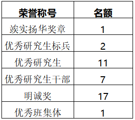个人荣誉称号含:竢实扬华奖章、优秀研究生标兵、优秀研究生、优秀研究生干部、明诚奖。具体评选条件请见《管理办法》。
