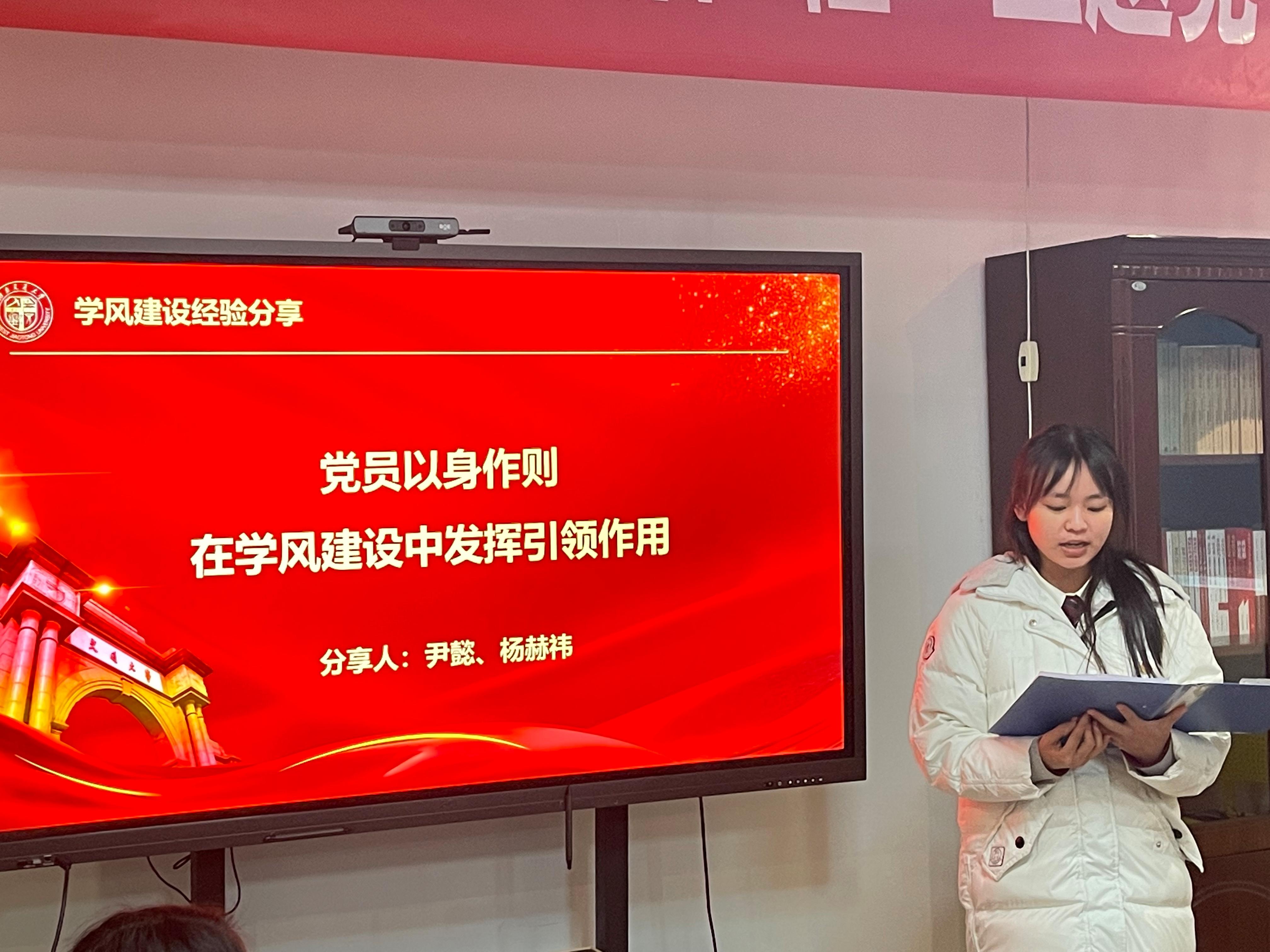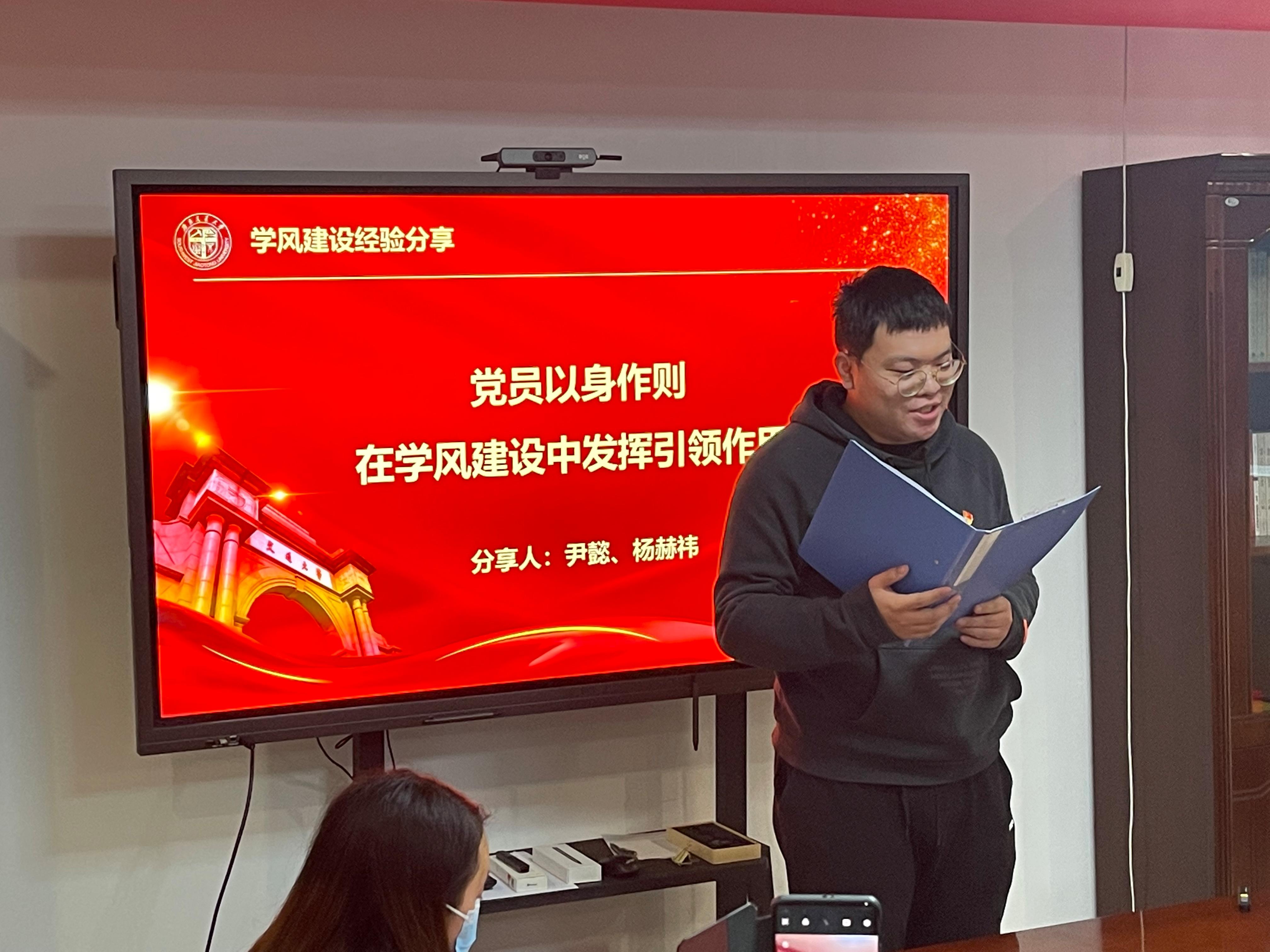 2名本科生党员代表分享学风建设经验。尹懿提到要发挥党员先锋模范作用,重视发挥党支部在公司学风建设中发挥的引领作用;杨赫祎则主要谈及自己的科创经历,以身作则,主动担当,发挥党员作用为低年级同学举办专业介绍会等经验。