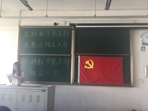 2015年5月30日下午16:00,数学第一第二党支部在X2532举行了党员发展及预备党员转正大会暨本科数学党支部换届大会。本次会议的主要议题是讨论吸收新同志入党和预备党员转正。党支部书记桂芸霞等有表决权的正式党员和转正预备党员及发展入党积极分子共同参加了会议,会议由数学第二党支部的韩雪娇同志主持。