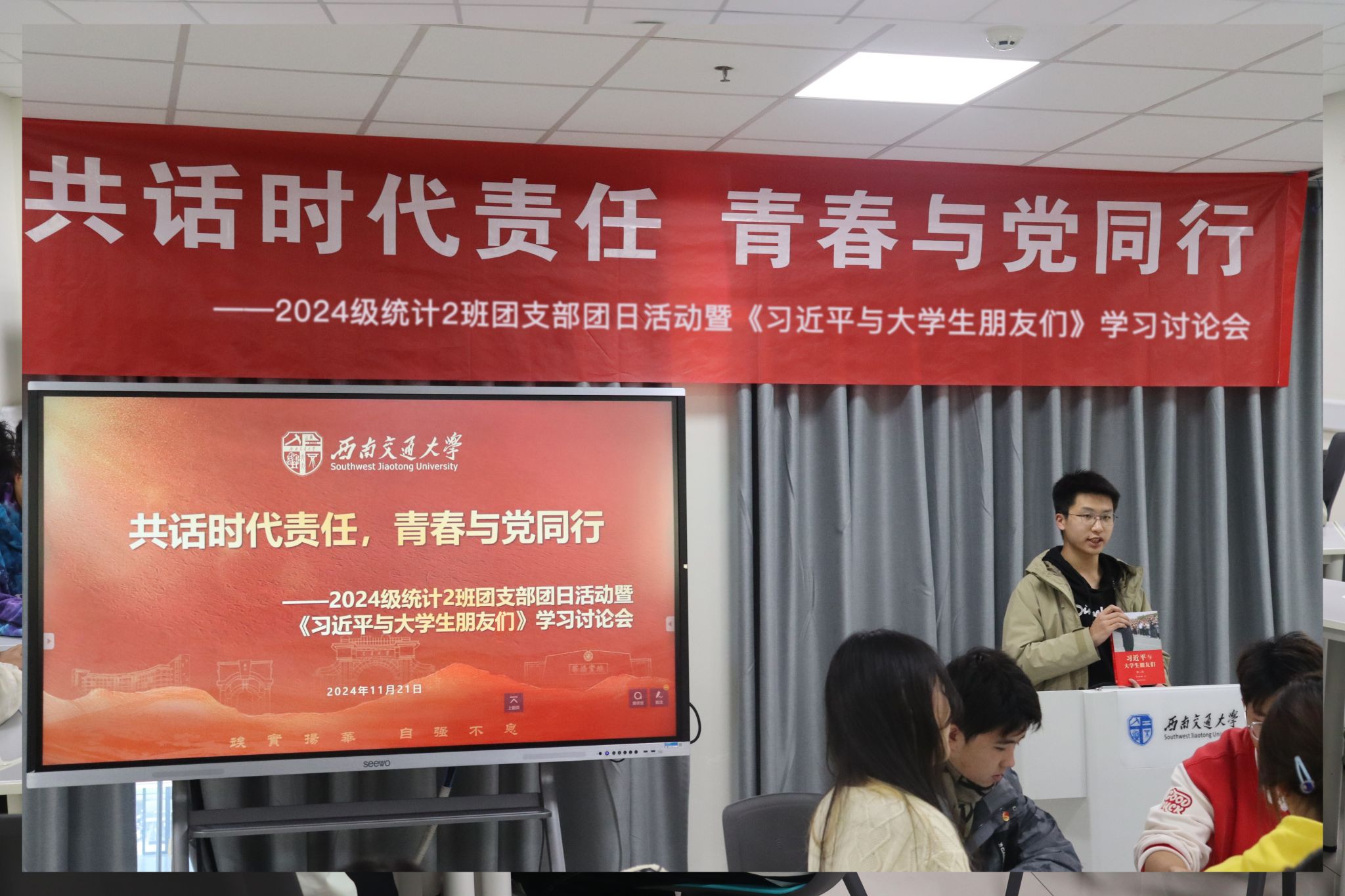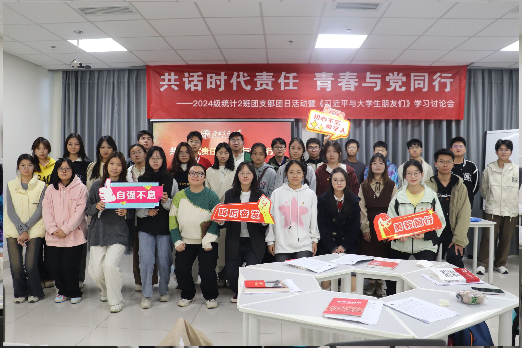 为深入学习贯彻习近平新时代中国特色社会主义思想,2024年11月21日,2024级统计2班团支部“共话时代责任,青春与党同行”主题团日活动暨《习近平与老员工朋友们》学习讨论会在X30384顺利举办。本次活动由团建中心詹延同学主持,30余名师生参加。