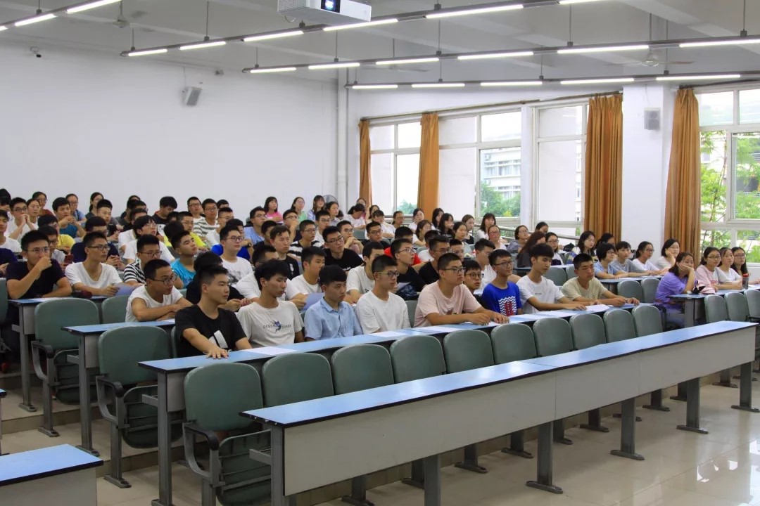 接下来,在钟老师的引导下,便是学习校歌阶段,由17届统计专业胡皓量与17届应数专业闵琮惠同学为18届数院新生教唱校歌。