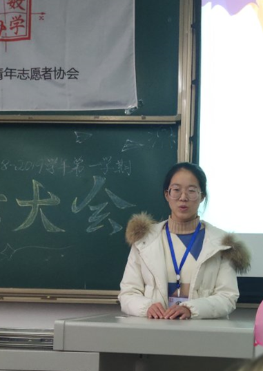 大会第一项,指导老师谢童心进行致辞。谢童心老师致辞简短明确,对所有青协人员这一学期的辛勤工作表达了感谢与认可,并表达了对青协美好未来的祝愿“希望我们的志愿者能够发挥专业所长,为更多人带去志愿服务”。
