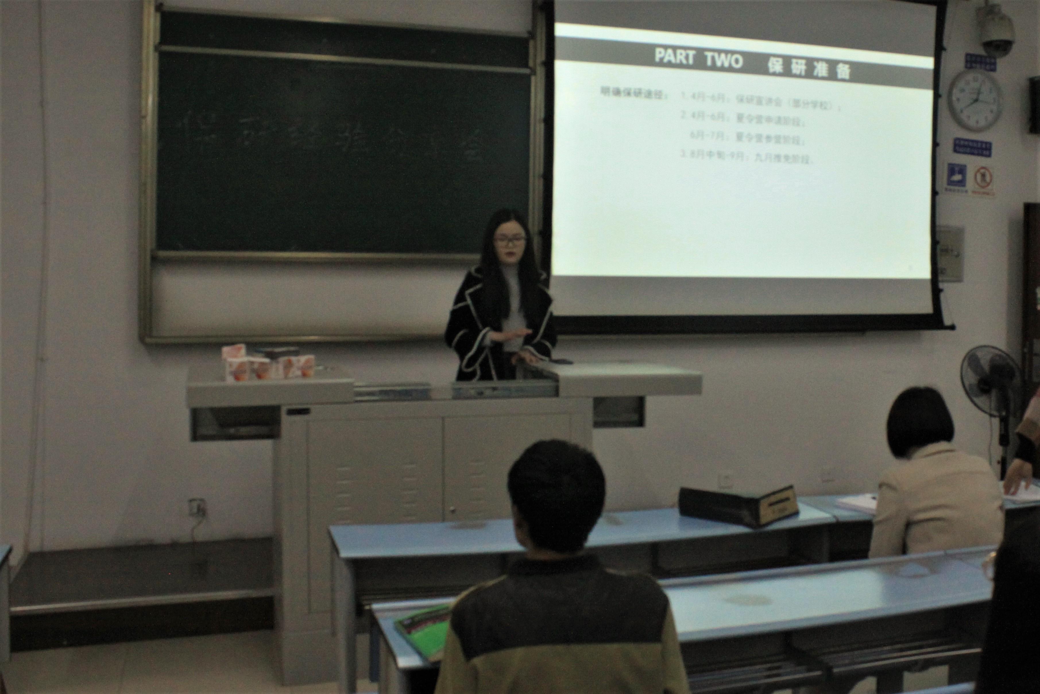 第二位上台分享经验的是15级专业排名第一的张嘉琪,其保研院校为中国人民大学。张嘉琪同学在分享经验的同时,还为到场同学介绍了一些保研方面的细节,继而鼓励同学要始终坚持,不能有丝毫的懈怠与放松。