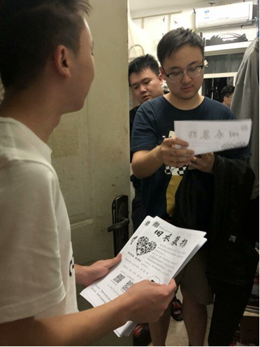 5月22日晚9时30分,旧衣募捐线下宣传活动开始了。数学青协的志愿者们分成几个小组,带着宣传单,在天佑斋宣传旧衣募捐活动。这次旧衣募捐面对的主要对象是即将毕业的大四员工。志愿者在宣传过程中,也解释了这次旧衣募捐的目的:青协将会与成都义工联系,将收来的旧衣捐赠给山区的孩子或是猫狗之家。宣传活动持续到晚11点,这次宣传很顺利,为后面几天的活动奠定了良好基础。