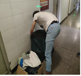 5月27日晚7时,到了旧衣整理的时候。志愿者们租来三轮车把放在寝室的旧衣运到x2426教室,在教室里整理衣服,分门别类地将衣服整理好。忙忙碌碌了两个小时才将衣服整理好,再放进提前准备好的收纳袋里,运到2503教室放好,等待捐赠。也有部分衣服存在过于损坏、破旧、发霉等问题,志愿者将这些衣服单独放进袋子里,整理完毕后扔到指定地点。