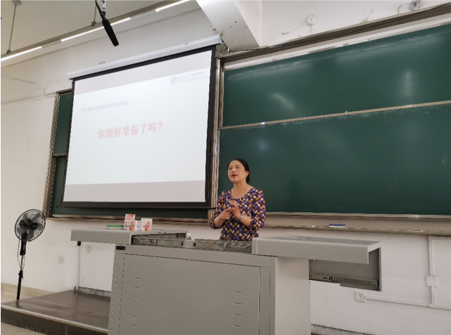会议第二项,人才招聘处黄春蓉副处长为同学们讲解就业形势。黄处长首先向同学们展示了两个问题——“面对毕业就业季,你是否已经做好准备?”“面临就业,你处于哪种状态?”,引起了同学们面对问题就业问题的思考。她提到,当前就业环境的结构性矛盾突出,高校、学历、学科、性别、地域甚至单位之间都存在着不平衡,但是由于经济的增长与国家促进普通高等公司毕业生的就业政策,当前老员工就业机会较多,提醒员工应当明晰多种就业渠道,了解就业,把握机会,做好就业准备。