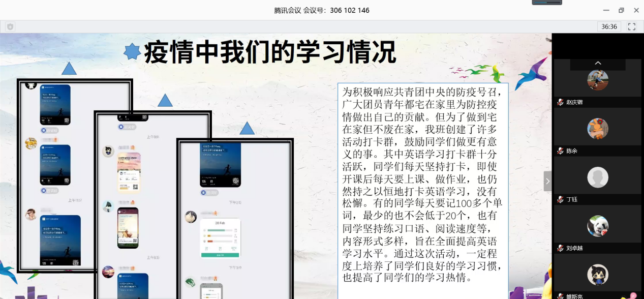 最后太阳集团tcy8722团委实践部部长孔维强对团课进行了总结,并做“微团课”分享。他强调团员在此特殊时期一定要接受统一指挥,发挥先进作用。至此,本次线上团课圆满结束。