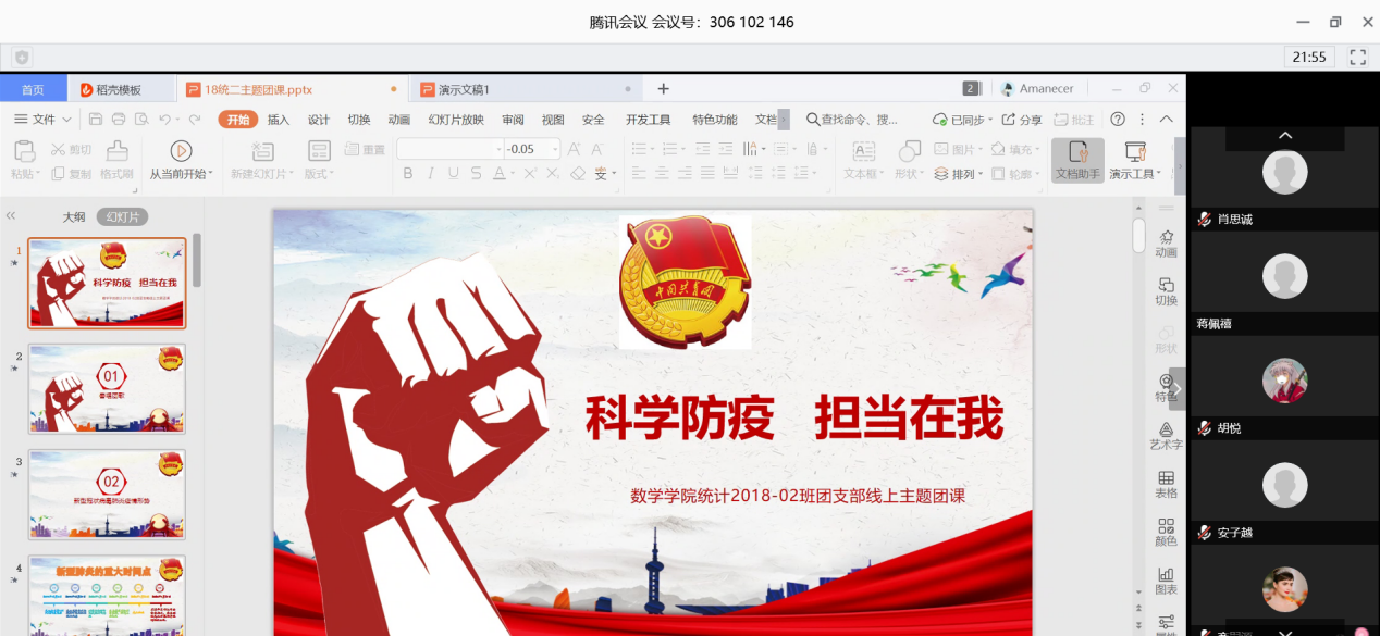 2020年的开年并不太平,新冠肺炎的横空降世极大地影响了中国人民的日常生活。战胜肺炎疫情是全体人民的切实心愿,也是我们共青团员肩上刻不容缓的责任。在这样的背景下,统计学2018级2班团支部以网课的形式,于3月5日开展“科学防疫,担当有我”主题线上团课。团支书李宏亮带领大家上了一堂意义深刻的团课。太阳集团tcy8722团委实践部部长孔维强、副部长懂欢宁参加团课,并做“微团课”分享。