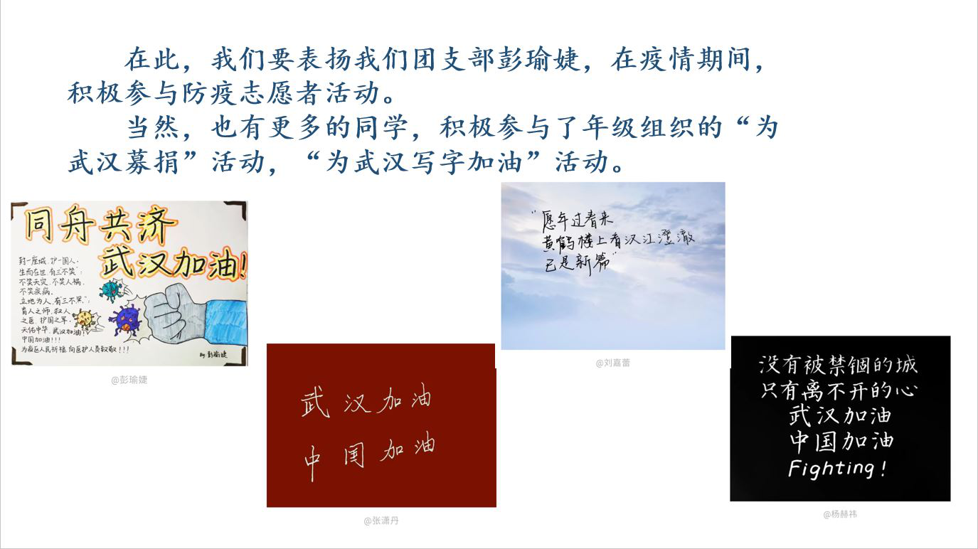 接着,团支部书记吴佩欣讲述了共青团员在这个特殊的时期如何发挥自己的青春力量,承担起新时代团员青年的责任与使命。她强调,党的指令,团的方向。共青团作为党领导的先进青年的群团组织,应充分展现青年突击队的作用,听从党的号令,积极投身抗击疫情的重大政治任务。要坚持“安全第一”的原则,注意防护措施,合理选择志愿方式,坚决打赢疫情防控阻击战。吴佩欣指出,在疫情期间,统计一班团支部很多团员积极地参与到了防疫宣传、为武汉募捐、手写加油等活动,特别赞扬了参与防疫志愿服务活动的彭瑜婕同学,并向大家展示了公司另外两项志愿活动的成果。