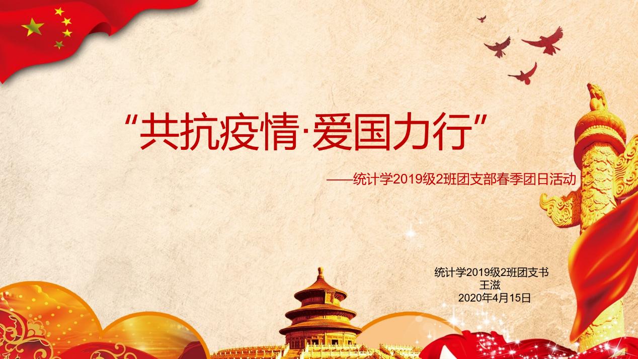 为深入学习贯彻习近平新时代中国特色社会主义思想和党的十九大精神、习近平总书记关于打赢新型冠状病毒感染肺炎疫情防控阻击战的重要指示精神,引导支部团员牢固增强“四个意识”、坚定“四个自信”、做到“两个维护”,在特殊时期积极应对疫情、落实防疫举措、强化思想引领、加强主题教育,根据公司团委要求,统计学2019级2班团支部于2020年4月15日晚上8时开展了2020年春季“共抗疫情·爱国力行”主题团日活动。本次线上团日活动由团支书王滋主讲,支部全体29名团员均准时参加。团支部“1+100”负责人郑艺梅受邀参加活动。