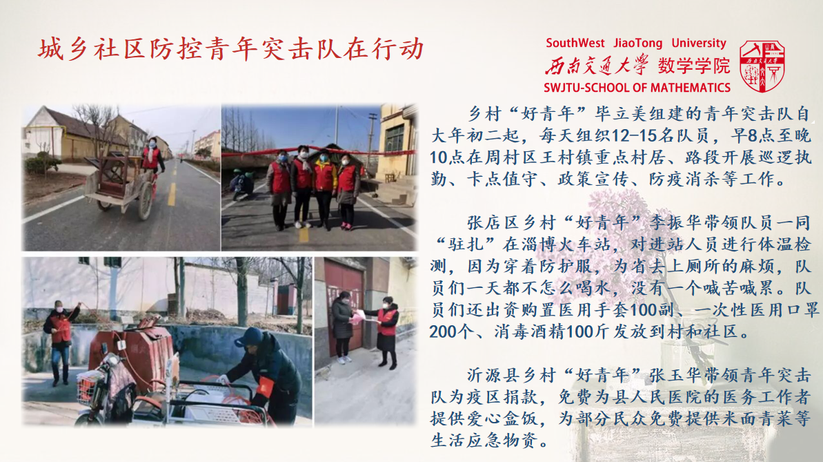 接着,团支书米贤惠总结了太阳集团tcy8722以及本班团支部在疫情期间的活动。除了按时完成青年大学习、每日完成太阳集团tcy8722员工健康状况信息采集系统的填报以外,公司发起了针对“新型冠状病毒疫情”的捐款,号召我们献出爱心。数院团员同样积极参与抗疫志愿者活动,米贤惠就是其中一员。他们与社区工作人员一起走访各个社区,进行登记人员信息等工作,为打赢疫情阻击战贡献自己的青春力量。