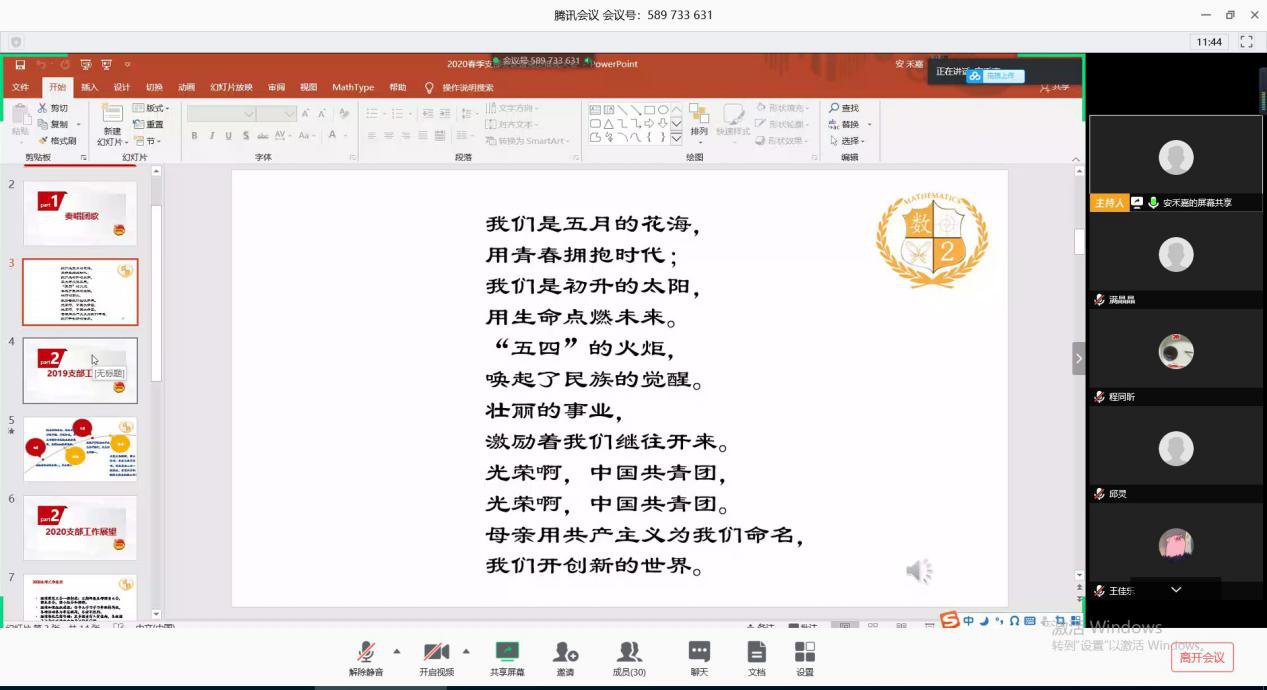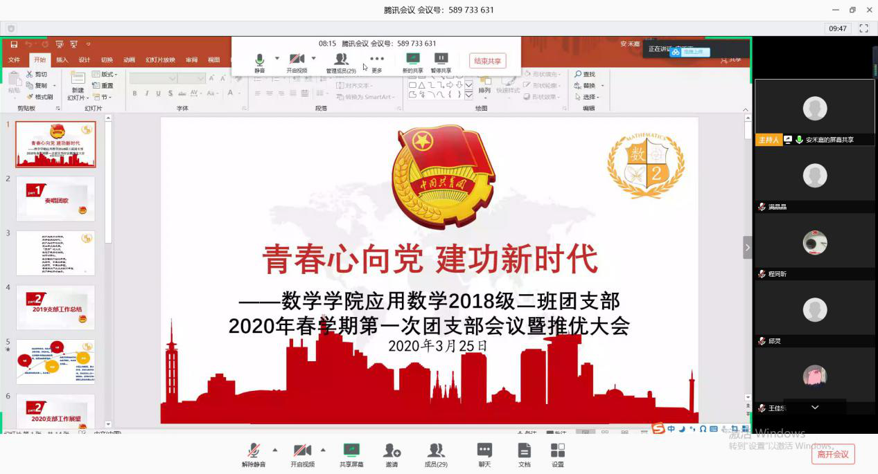 为深入学习贯彻习近平新时代中国特色社会主义思想和党的十九大精神,落实“加强团的基层建设”工作要求,引导支部团员牢固增强“四个意识”、坚定“四个自信”、做到“两个维护”,根据公司团委有关工作安排,太阳集团tcy8722应用数学2018级2班团支部于3月25日开展了2020年春学期第一次团员大会暨积极分子推优大会。大会主题为“青春心向党·建功新时代”,由团支书邱灵、副团支书安禾嘉主持。除特殊情况外,支部全体团员参加会议。团支部“1+100”负责人,公司团委组织部部长林玉受邀参加本次会议。