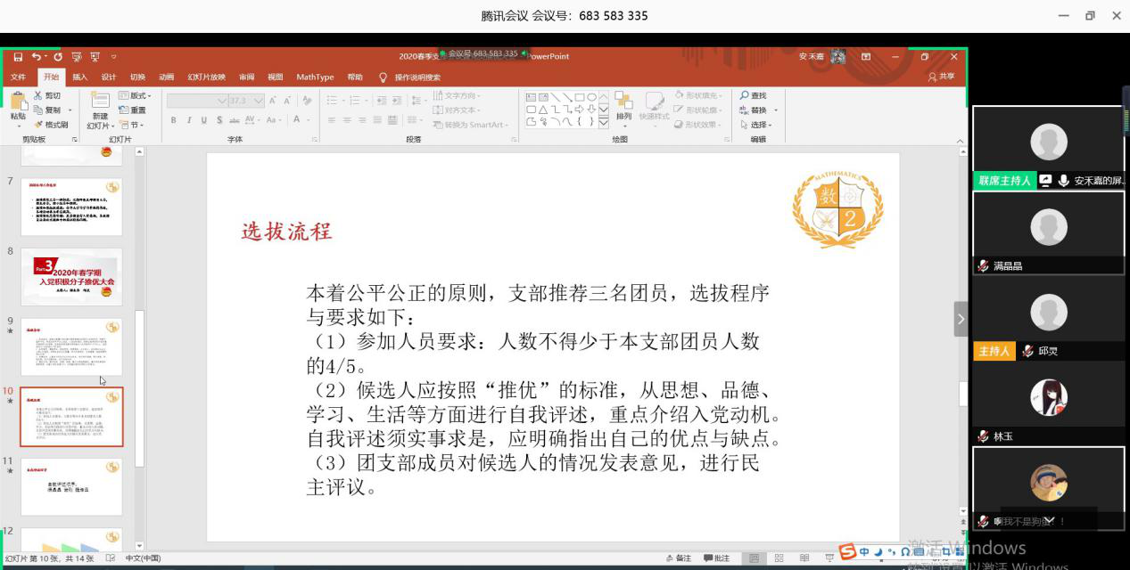 接着,团支书邱灵主持2020年春学期支部入党积极分子推优大会。此次推优大会,秉持公平公正公开的原则,选拔三名支部团员进行推优。符合参选条件的三名团员满晶晶、魏培丞、谢刚分别做自我评述,团支部成员支部团员对候选人的情况发表意见后,在班群里进行投票推选。经投票统计、结果公示,三位团员均符合推优条件,现团支部已将结果反馈上级团委。