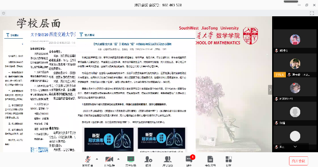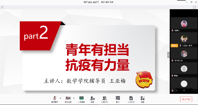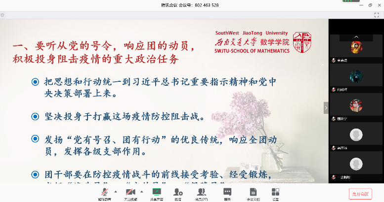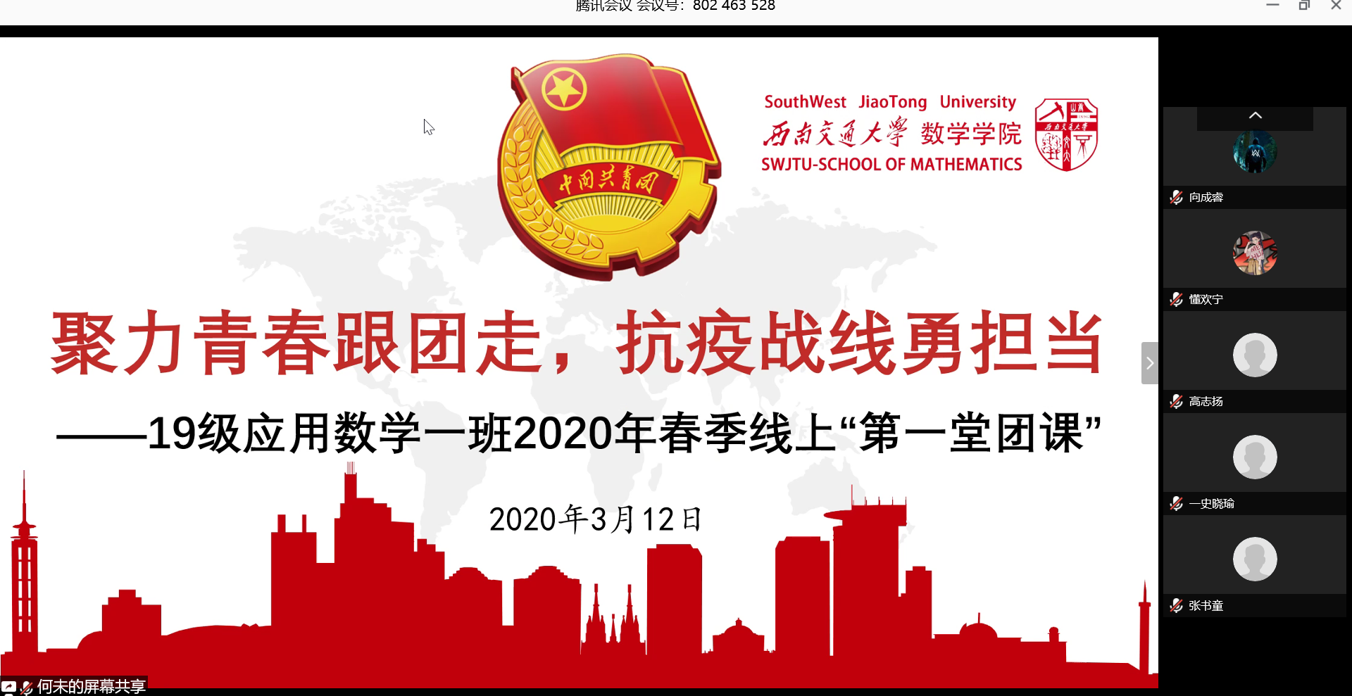 疫情当下,开学延迟。为响应公司团委号召,太阳集团tcy8722数学与应用数学2019级1班团支部全体团员在团支书冯玉的带领下,参加了以“聚力青春跟团走,抗疫战线勇担当”为主题的2020年春季线上第一堂团课。2019级辅导员王亚梅,团委组织部部长林玉受邀参加,并做团课分享。