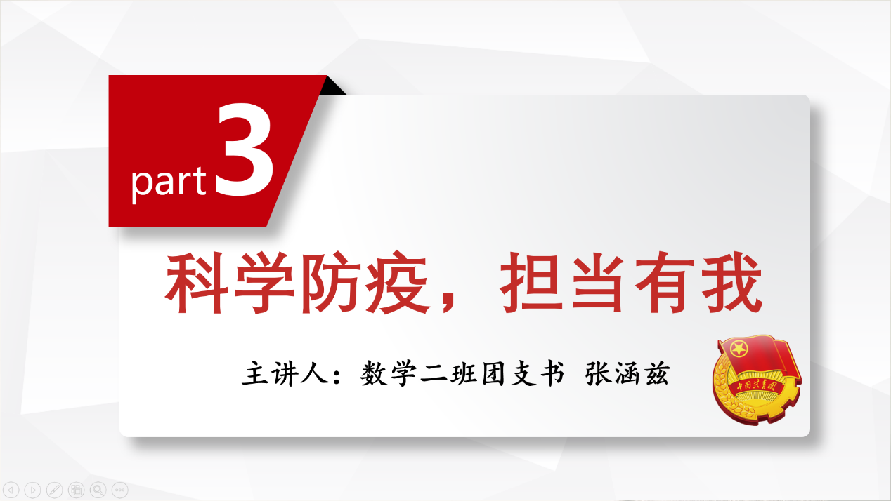 最后,数学二班班长刘昱伯总结到:乌云遮不住太阳,阴霾终究将散开。没有一个冬天不能逾越,没有一个春天不会到来。我们坚信,在党的英明领导下,中国人民一定会万众一心,共克时艰,取得这场“战役”的胜利!