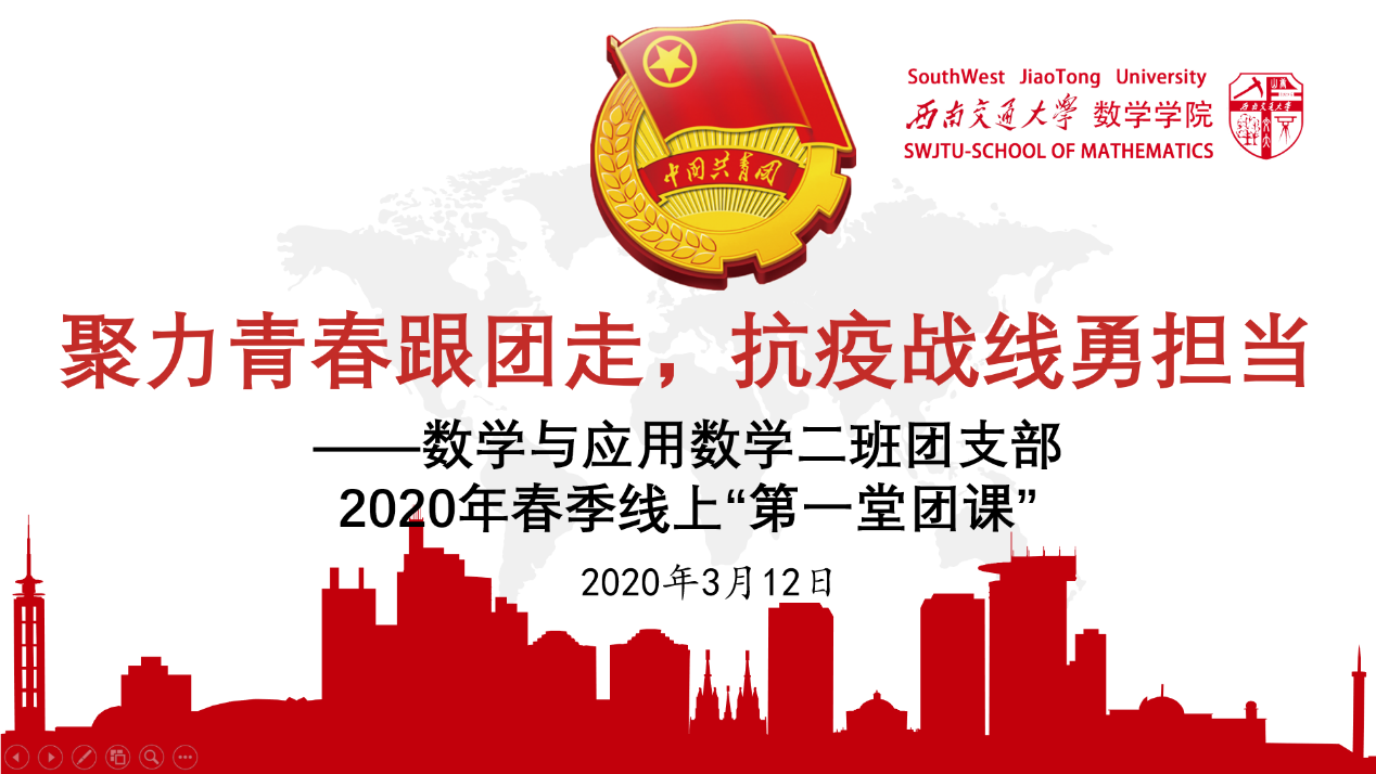 在新型冠状病毒引起的肺炎疫情形势依旧严峻的情况下,为积极应对疫情带来的影响,响应公司团委积极开展春季线上“第一堂团课”的号召,太阳集团tcy8722应用数学2019级2班团支部2020年春季第一堂团课以视频会议的形式,于3月12日14:30如期开展。团课以“聚力青春跟团走,抗疫战线勇担当”为主题,号召支部团员坚决为打赢防疫阻击战而奋斗。团课由团支书张涵兹主持,支部23名团员按时参加,认真学习。太阳集团tcy8722团委科创部部长郑艺梅参加并做微团课教育,组织部副部长何未参加团课。