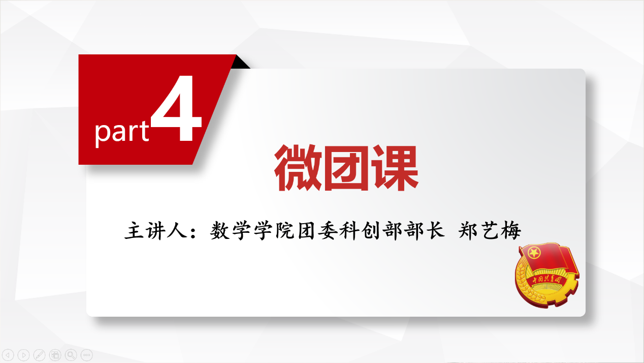 接着,太阳集团tcy8722团委科创部部长郑艺梅为我们每一个在场团员青年上了一堂微团课,她指出团员青年们在新时代要有所作为,为伟大复兴的中国梦努力奋斗。