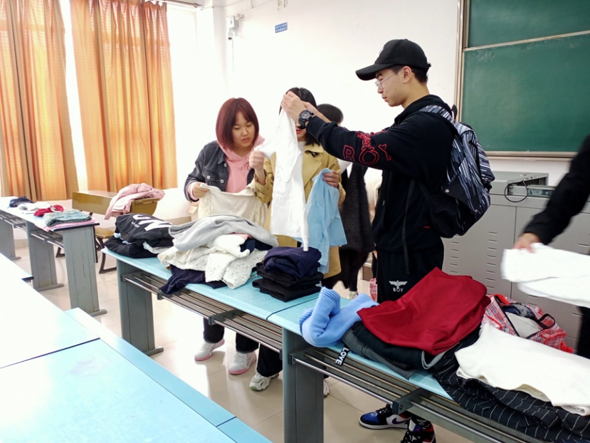 11月10日下午3时50分,志愿者们将衣物送至x2416整理、分类并进行包装。打开一包又一包的衣物,那都是捐衣者的爱心满怀热忱,志愿者们按照性别、薄厚程度、穿着季节和用途方面衣物进行分类打包。整理过程持续了将近七十分钟。
