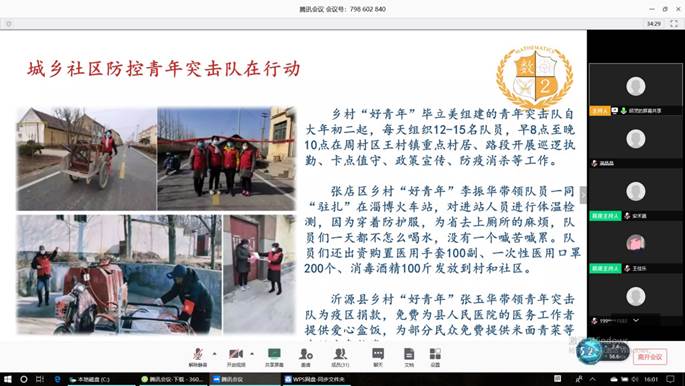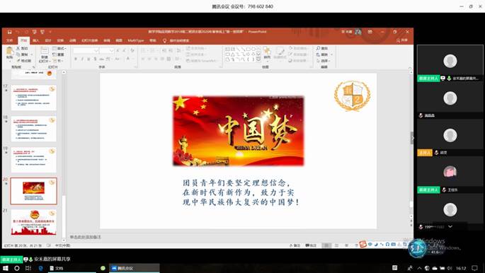 在新型冠状病毒引起的肺炎疫情形势依旧严峻的情况下,为积极应对疫情带来的影响,响应公司团委积极开展春季线上“第一堂团课”的号召,太阳集团tcy8722应用数学2018级2班团支部2020年春季第一堂团课以视频会议的形式,于3月5日15:50如期开展。团课以“聚力青春跟团走,抗疫战线勇担当”为主题,号召支部团员坚决为打赢防疫阻击战而奋斗。团课由团支部书记邱灵主持,支部32名团员按时参加,认真学习。太阳集团tcy8722团委委员、组织部部长林玉参加并做微团课教育,组织部副部长王昕然参加团课。