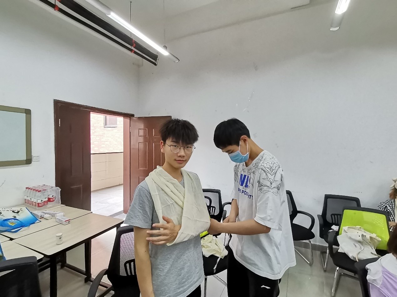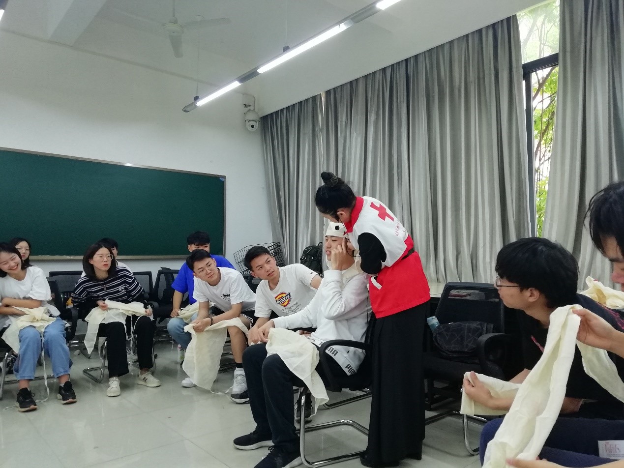 第一天的培训中,老师为同学们讲述了红十字会的发展历史,并进行三角巾、绷带多种用法实际操作演示,之后将三角巾、绷带发放给每一位同学,让同学们亲手练习。最后老师对学员们进行了实操测试考核,全体学员都出色地通过了考核。