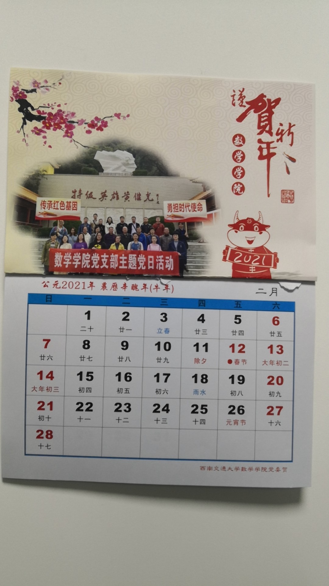新春伊始,数学机关党支部组织了“迎新春 送春联 传爱心 送祝福”活动,为每名党员准备了新春春联和挂历,给各位党员们带来来了新春的祝福。
