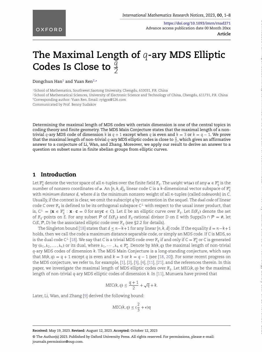近日,公司数学与信息交叉团队副教授韩冬春博士以第一作者在国际高水平综合类数学期刊《International Mathematics Research Notices》上发表论文《The maximal length of q-ary MDS elliptic codes is close to q/2》。《International Mathematics Research Notices》是国际著名的高水平综合性数学期刊,由牛津大学出版社出版,旨在发表“当代数学热点研究领域的高质量研究成果”,是中科院SCI期刊数学1区top期刊。