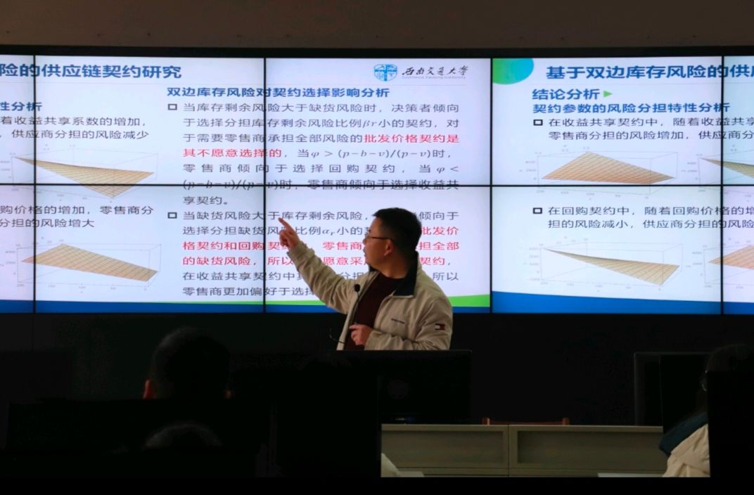 在交通运输与物流公司,蹇明教授为同学们讲解了基于双边库存风险的供应链契约研究,他通过成都实际烟草调度配置问题,让同学们感受到大数据在未来研究中的价值,并且切身体会到了数学在其中的重要性。