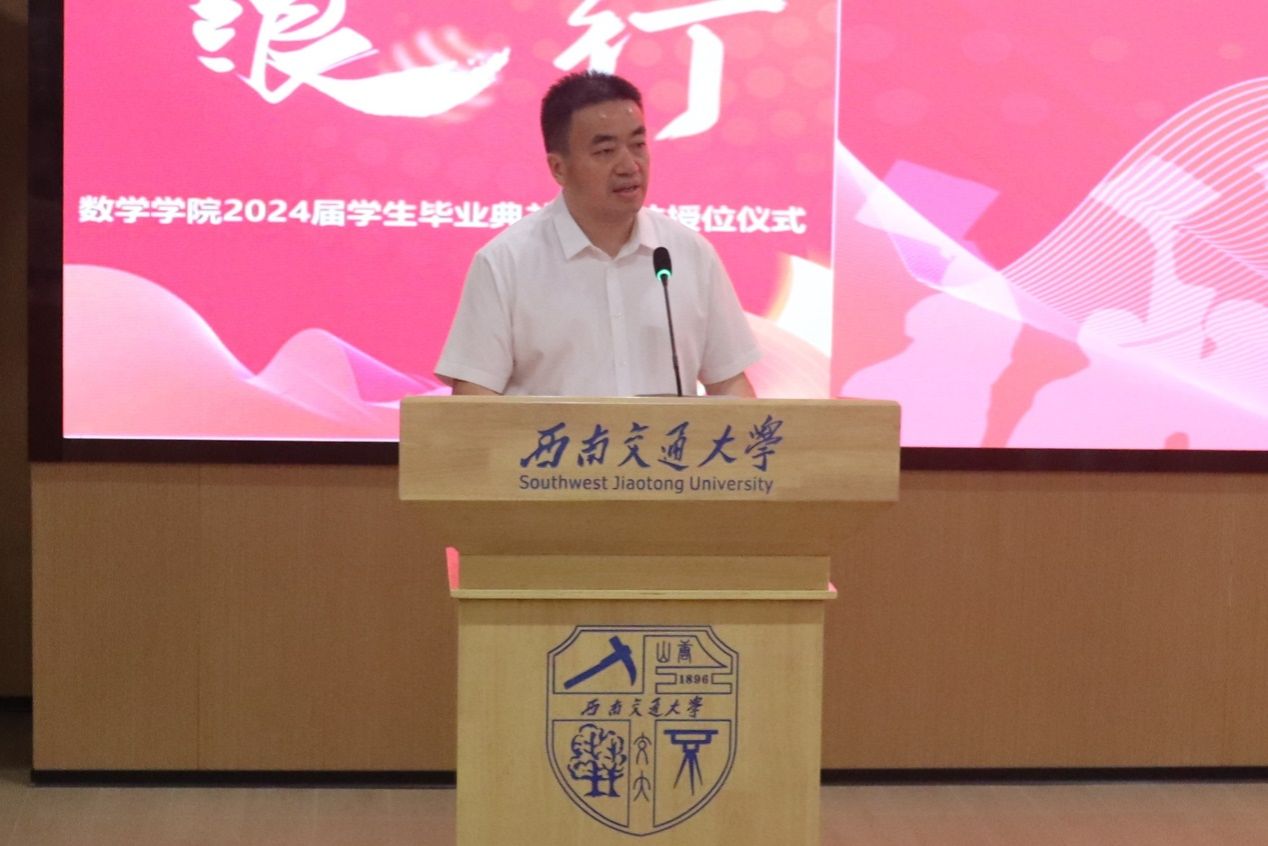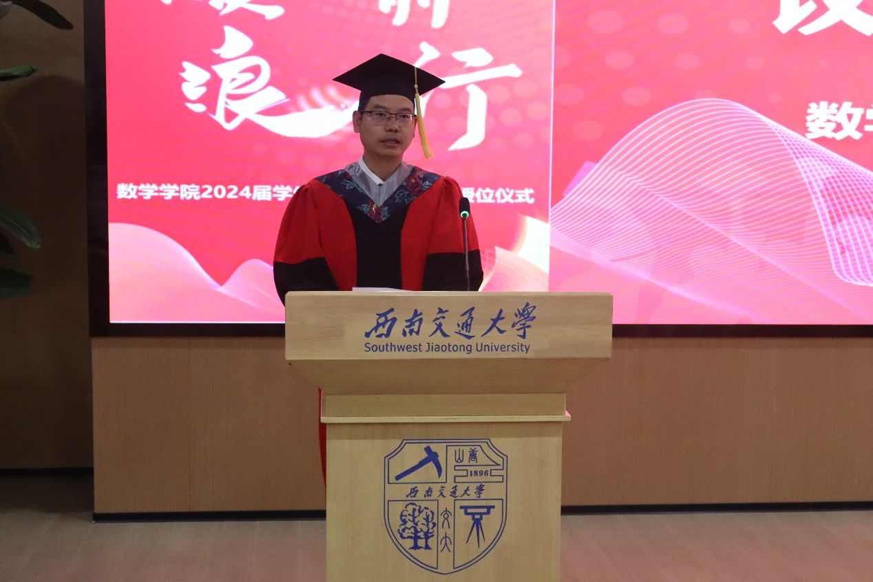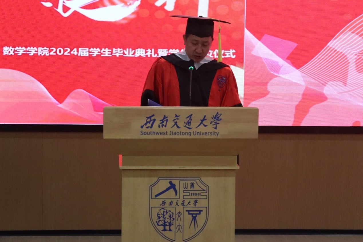 典礼第一项,经理杨晗教授致辞。杨晗院先向2024届全体毕业生致以热烈的祝贺,对教职工、家长亲友的辛勤付出表示诚挚的感谢。离别之际,杨晗经理对毕业生寄予四点厚望,一为:做一个对得起国家、社会和自己的人。要志存高远、勤奋笃行、不断进取、追求卓越,成为“为学、为事、为人”的典范。二为:做一个热爱学习、保持奔跑的人。信息时代是数学人大有作为的时代,要始终保持一种学习的状态,锻炼改造自我、改造社会的能力,自信从容地面对未来的挑战。三为:做一个独立思考、温暖纯良的人。保持独立思考的能力,经历人生的磨砺后依旧怀抱善良和热爱,与世界共同成长。四为:做一个赶路并欣赏风景的人。尽管未来充满未知与挑战,也要保持平常心,享受旅途的每一个瞬间。最后,杨晗经理再次祝愿2024届毕业生们“所见皆美好,所行皆坦途,所爱皆可得,所想皆如愿”。
