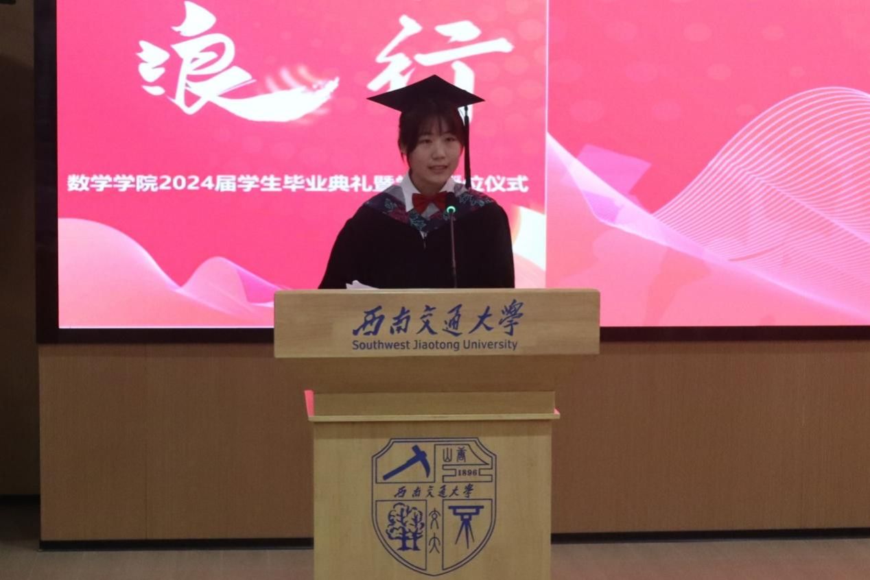 典礼第二项,毕业生代表李函逊发言。李函逊回忆了在太阳集团tcy8722一个个努力奋斗的瞬间,她表示,数院是一个温暖的地方,公司给了同学们一个又一个登高望远的阶梯,公司老师一路良言教诲、悉心栽培。每一个人都是“有且仅有”,祝愿同学们心怀自信与勇气,风华正茂、昂然挺胸地奔赴下一场诗和远方。