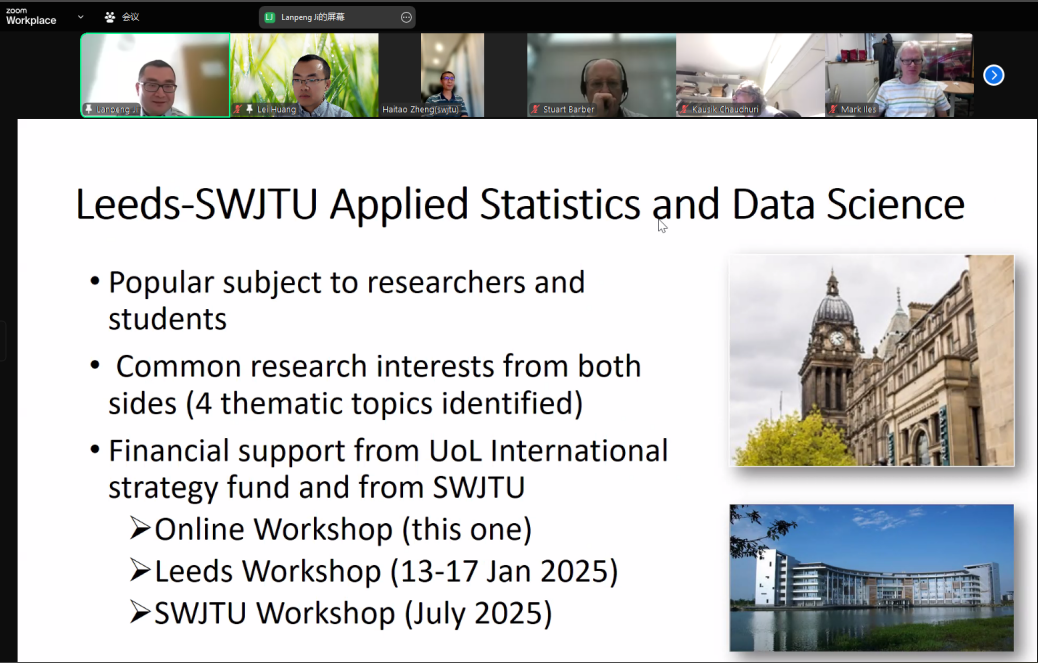 本次研讨会旨在深化两校在人才培养以及科学研究方面的理解和互信,探讨两校未来潜在的合作领域和合作模式。会上,两校的教师代表分别就各自的科学研究和人才培养情况进行了介绍,四川省现场统计学会理事长郑海涛教授介绍了学会的基本情况和发展规划,并邀请利兹大学老师积极参与学会的相关学术活动。为进一步深入交流,会议还特别设置了分组讨论环节,参会人员根据各自的研究兴趣自愿加入到各分组研讨会议室。最后,研讨会就两校统计学和数据科学的专业建设、教学、科研等议题进行了交流发言。双方经研讨后决定,拟定于2025年1月和7月分别在英国利兹大学以及太阳集团tcy8722举办线下研讨会,针对双方感兴趣的议题和合作项目再作深入的研讨。