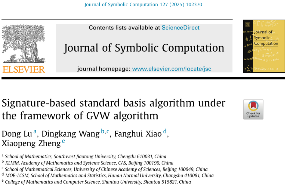 近期,公司鲁东副教授最新研究成果发表在符号计算领域权威期刊《Journal of Symbolic Computation》上。鲁东副教授为该论文第一作者,合作者包括中国科公司系统所的王定康研究员、湖南师范大学的肖方慧老师和汕头大学的郑晓鹏老师。《Journal of Symbolic Computation》是由欧洲科公司院士Bruno Buchberger教授于1985年创办的符号计算领域的权威期刊,我国著名数学家吴文俊院士曾担任该期刊的第一届编委。该杂志涉及的研究领域包括计算代数、计算几何(非线性)、符号计算语言和系统的设计与实现等。目前该期刊是中国数学会推荐的T2期刊。
