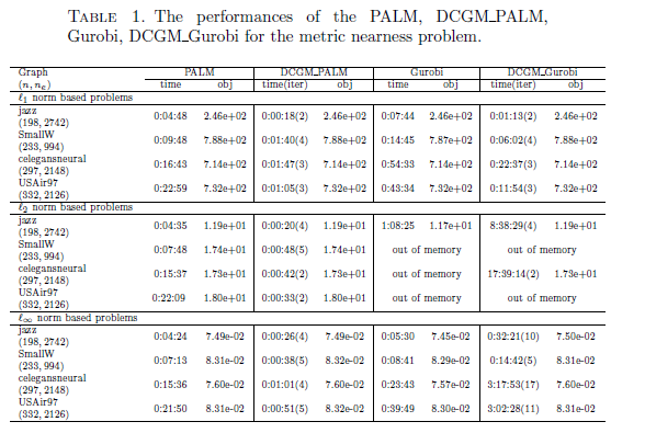 该算法充分利用与度量约束相关矩阵的特殊结构,避免了高内存存储的需求。数值实验表明,该算法不仅在该领域中具有最高的效率,还可以处理多达10^8个变量和10^13个约束的问题,显著提升了可处理的度量接近问题的规模标准。以下表格列出了该文所提算法DCGM_PALM与被广泛应用于学术研究和工业界的高性能软件Gurobi对比的数值结果。