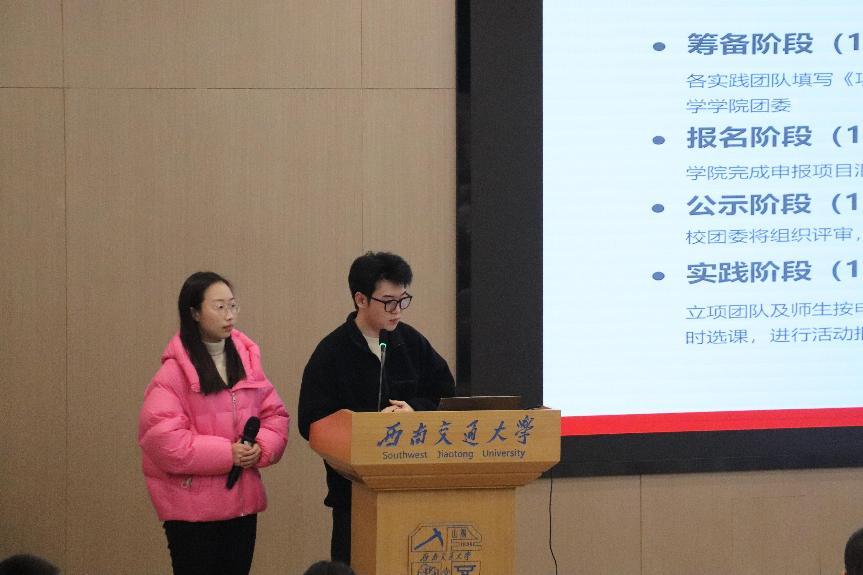 团建中心王星阳与青年志愿者协会杨越溪共同宣讲寒假“返家乡”社会实践活动的相关事宜。王星阳从申报流程、公司支持等方面详细介绍了寒假“返家乡”社会实践活动的申报事宜。杨越溪则阐述了参与社会实践对老员工全面发展的重要意义,并为同学们提供实例介绍及经验分析,鼓励2024级同学积极参与实践,为自己的老员工活增添一抹亮丽的色彩。