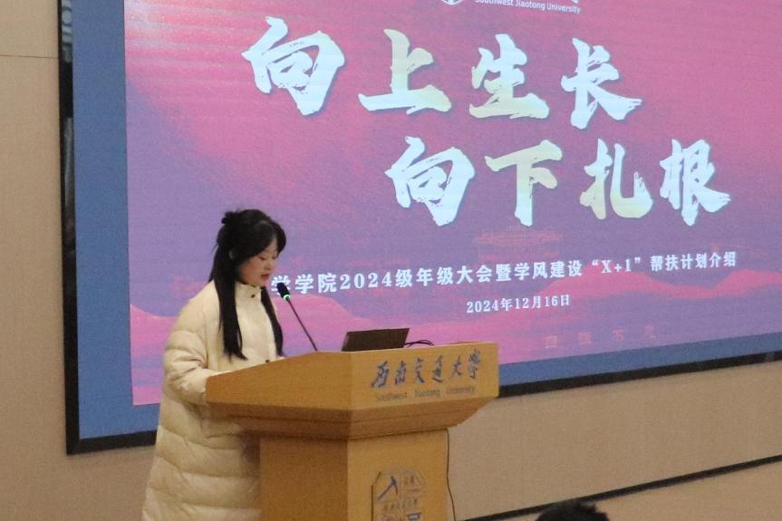 黄祥副书记为2024级本科生介绍学风建设“X+1”帮扶计划实施规划。本学年的帮扶计划选配优秀学长72名,成立37个帮扶小组(含职工小组),帮助新生适应学习,养成良好学习习惯,明确未来发展规划,形成积极进取态度,提供学业指导、竞赛科创、社会实践、生涯规划、谈心交流等多方面内容,实现了学风建设“X+1”帮扶计划新生全覆盖。
