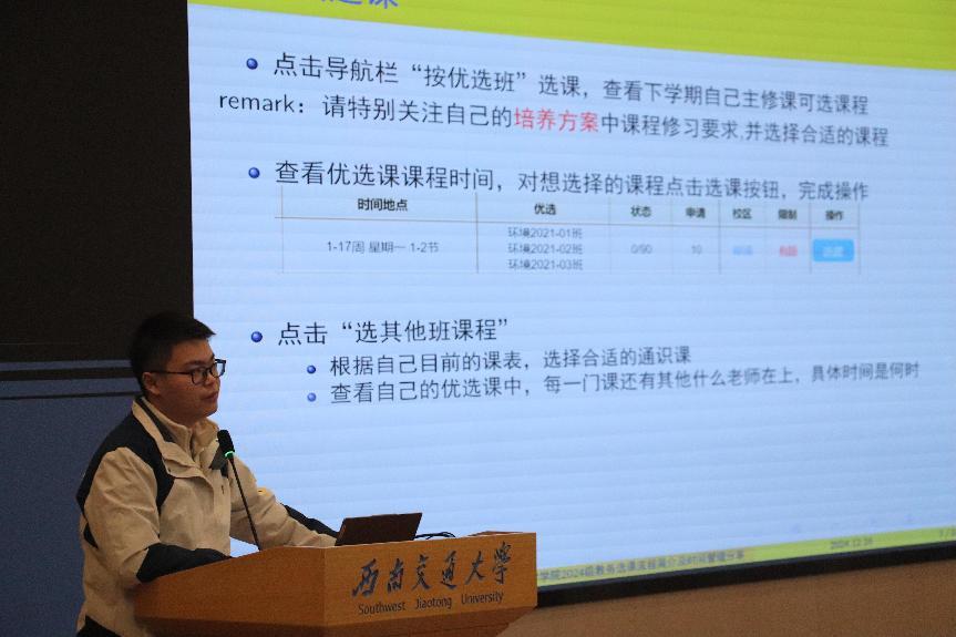 优秀员工代表赵彦通为2024级本科生详细介绍了教务选课流程。他清晰阐述了三次选课的目的以及选课机制,并通过实际操作为同学们提供了具体的选课指导,帮助每位同学都对选课过程有全面深入的了解。随后他从自身经验出发,分享了如何通过选课来实现时间的更好利用,同时强调了合理安排课程时间的重要性,帮助同学们更高效地利用时间,更充实地度过老员工活。