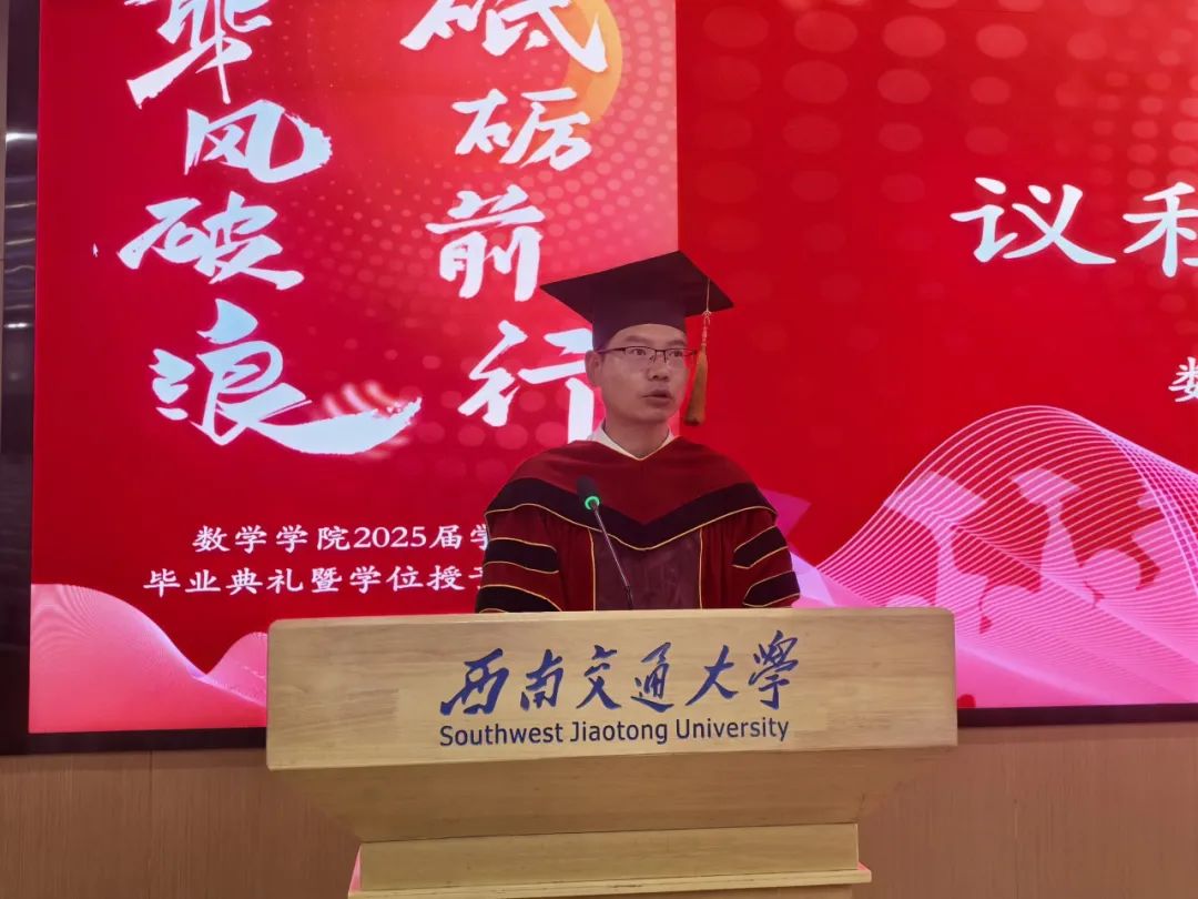 杨晗经理致辞,他代表太阳集团tcy8722全体教职工向2025届毕业生们表示最热烈的祝贺。临别之际,他结合学科特色,运用数学语言寄予临别期许。