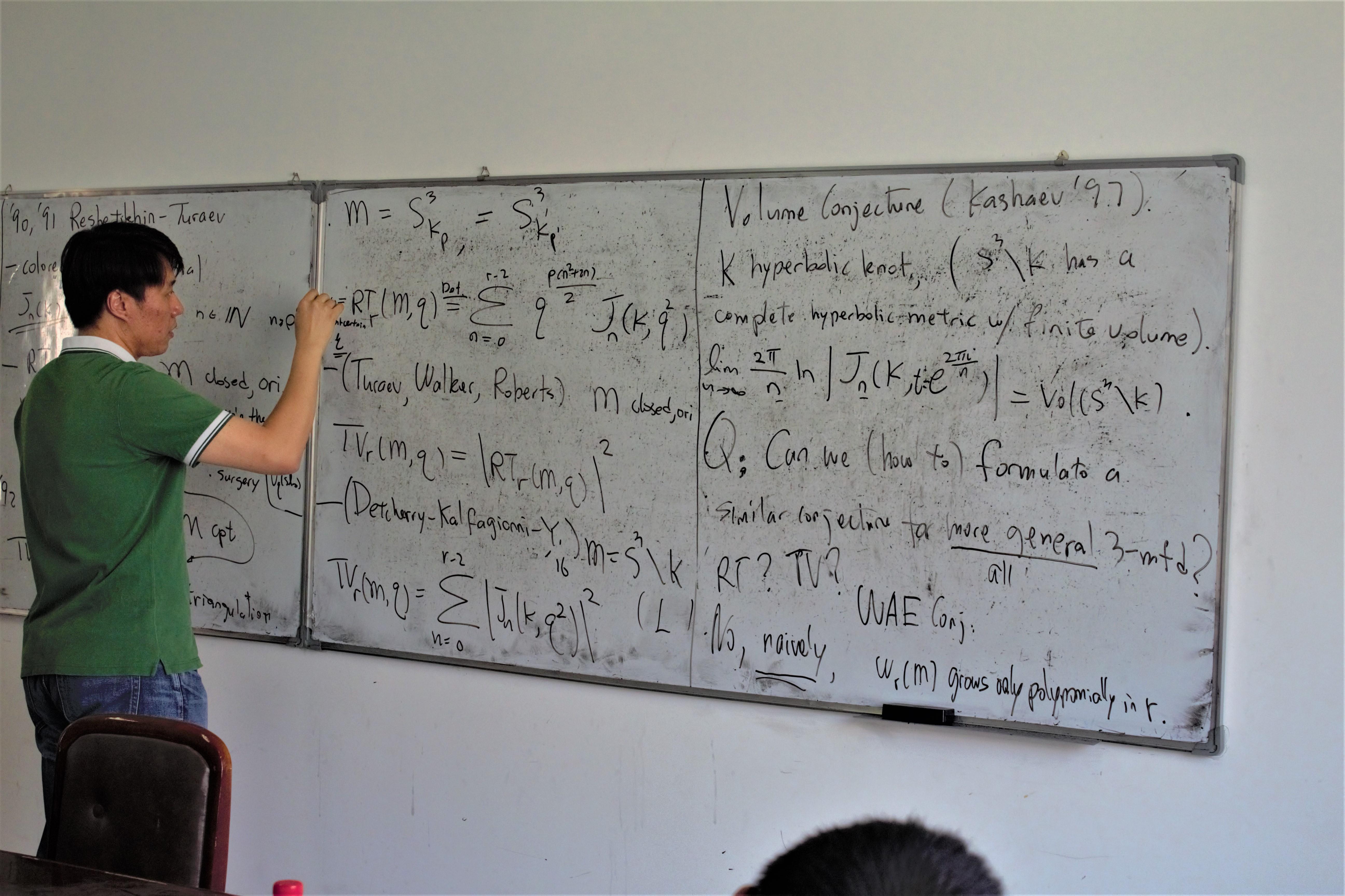 2018年6月4日下午3点,杨田老师在X2415做了题为“近日关于Turaev-Viroin不变量的相关体积猜想(Some recent progress on volume conjucture for the Turaev-Viroin variants)”的学术报告,来自四川大学和公司太阳集团tcy8722的老师参加了本次报告会。报告主要介绍了量子拓扑当中的几个量子不变量,以及杨田老师通过更换单位根和利用理想三角剖分的方法所做的相关工作。