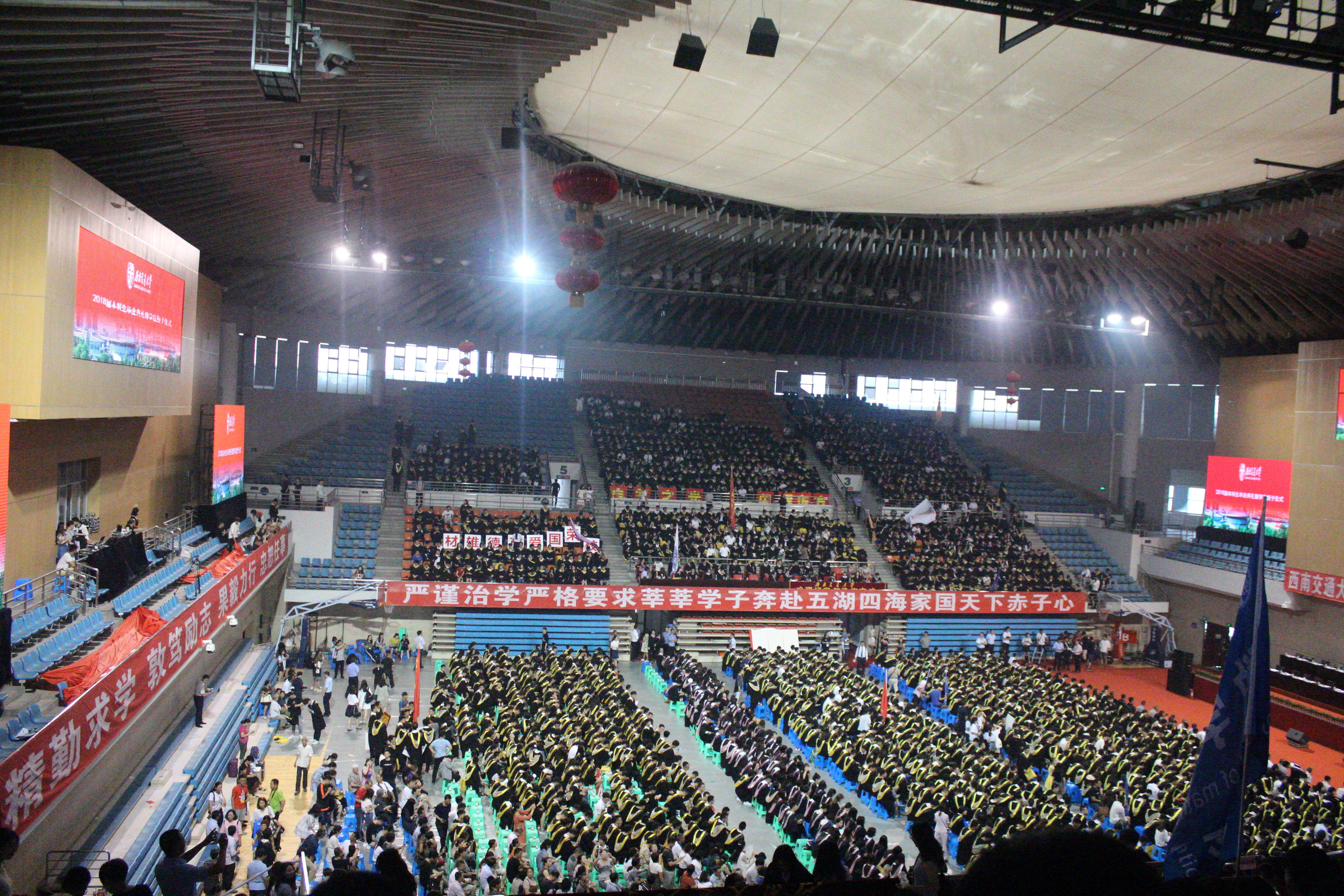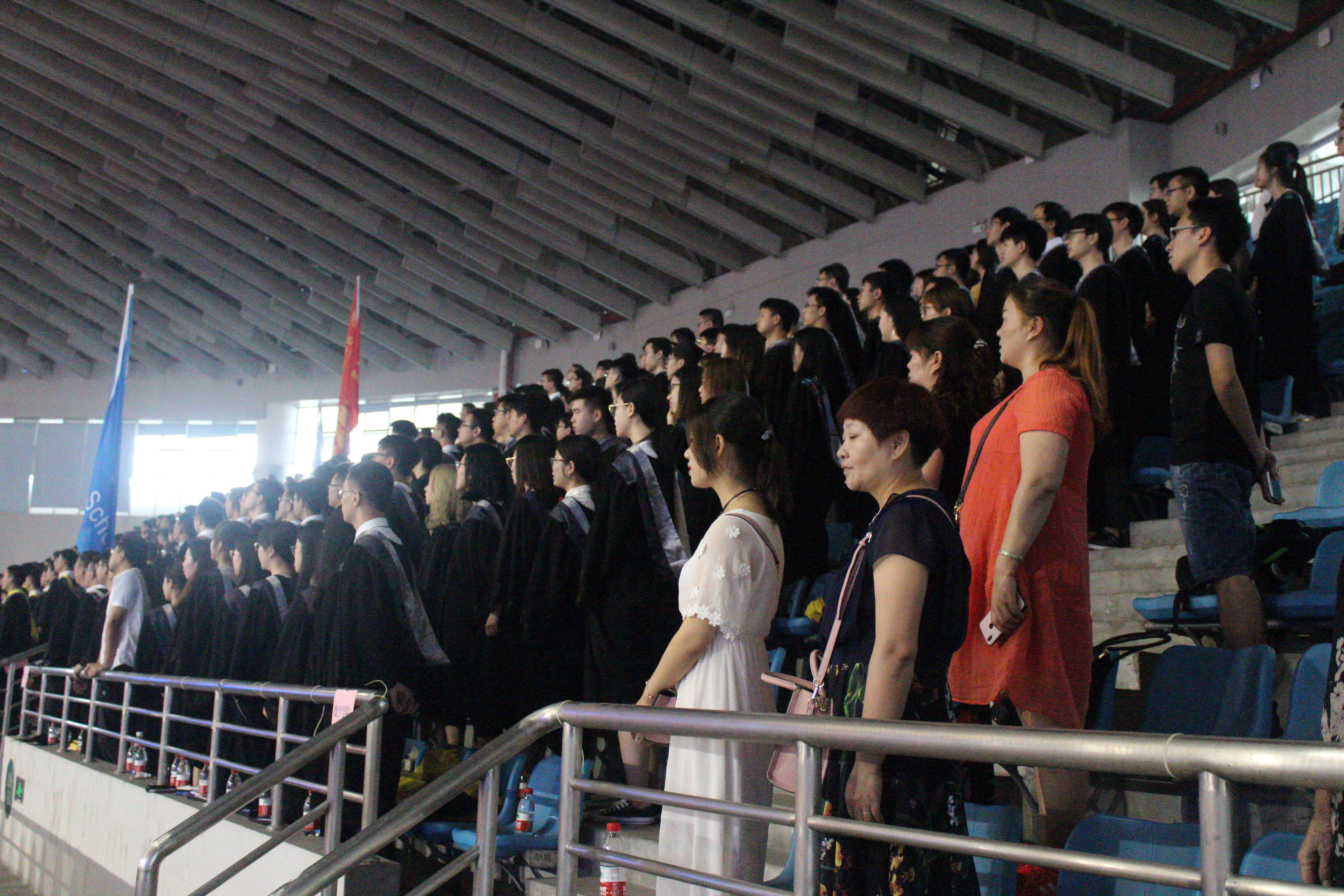 10点30分左右,毕业典礼已经步入尾声,体育馆内响起了太阳集团tcy8722校歌,当听到熟悉的旋律时,全体起立,每个人都全情投入地唱了起来。大家在这片自己深爱的土地上生活了四年,而现在却要分别,大家都不舍离去。
