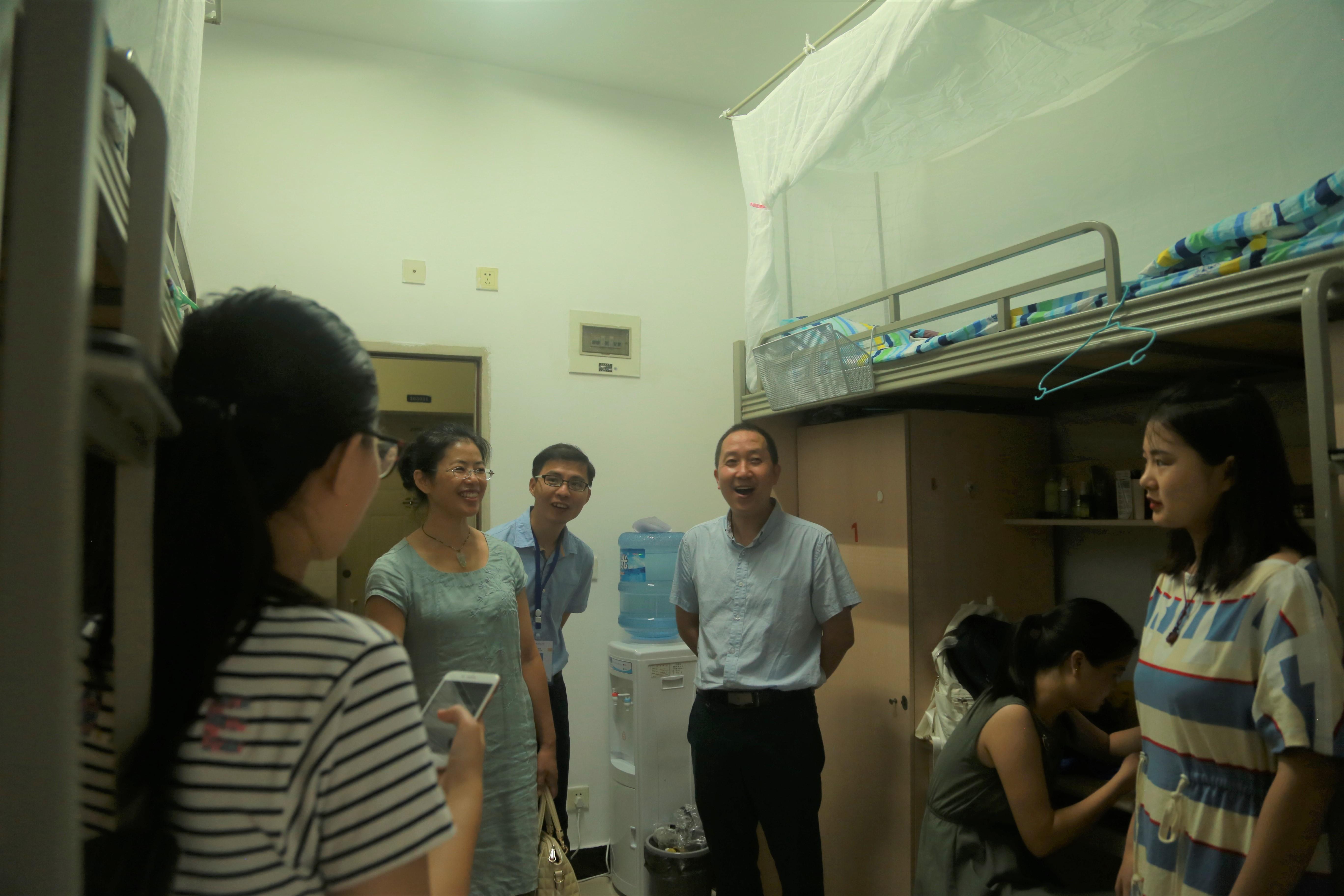 随后,院领导们来到太阳集团tcy8722新生所在的寝室,看望刚刚入住的同学们。徐书记和杨经理重点关注了寝室环境安全与卫生的保障,希望让新同学们能够住在一个舒适的环境中。新同学们对于领导的亲切关怀也表示了感激。