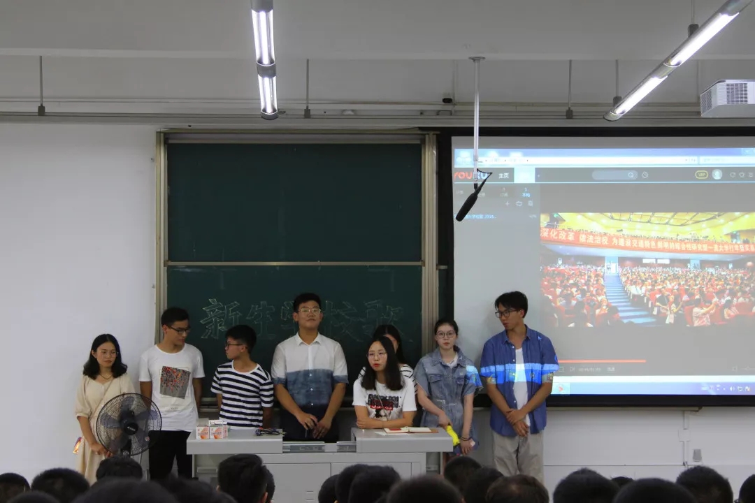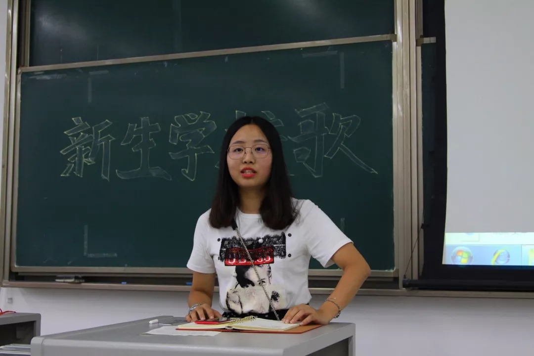 接下来,在钟老师的引导下,便是学习校歌阶段,由17届统计专业胡皓量与17届应数专业闵琮惠同学为18届数院新生教唱校歌。
