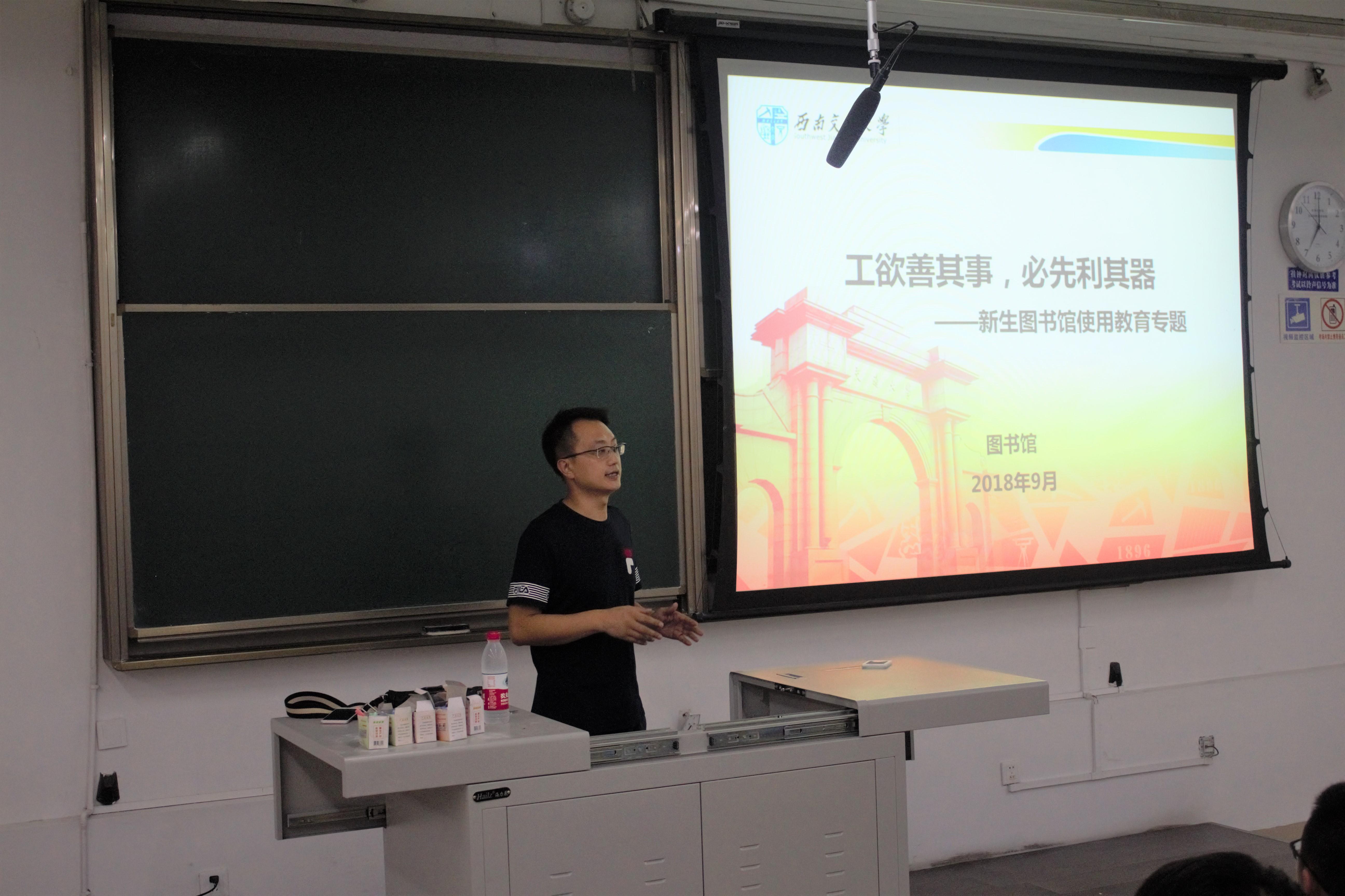 图书馆主讲人都兴宇老师分别从三个方面向本科新生讲述现今图书馆的概况。“工欲善其事,必先利其器”是本次图书馆入馆教育的专题。一个事情想要做好,必然要有好用的物器从外帮助,旨在告诉新生要好好利用图书馆的一切资源。紧接着,都老师引用了哈佛董事长的观点,“人与自然的和谐统一”,要求新生好好认识和了解图书馆。犀浦校区的图书馆为大家提供了学习、研究和娱乐的物理空间,是集文化、交流、学习中心和育人中心于一体的现代化新型图书馆。随后,都老师向大家介绍了公司图书馆的悠久历史,引出一系列图书馆搬迁和修缮的历史,启发新生珍惜现在的图书馆资源。