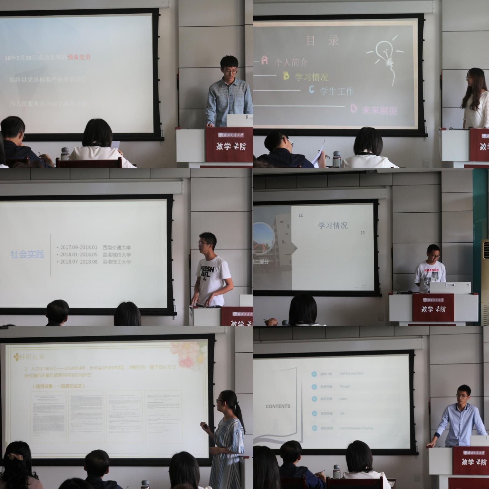 答辩开始之前,杨育鸿书记首先介绍了本次评选的规则以及参选条件,宣读了“三评”纪律提醒和要求。随后,评比正式拉开大幕。首先进行的是国家奖学金答辩,何适、张雁灵、孙济仁、郑伟杰、张璇、蔡逸六位答辩候选人均为三个年级的专业第一名,他们分别从学习情况、科研竞赛、员工工作、社会工作等方面进行了展示,每位同学都具有优秀的综合实力。