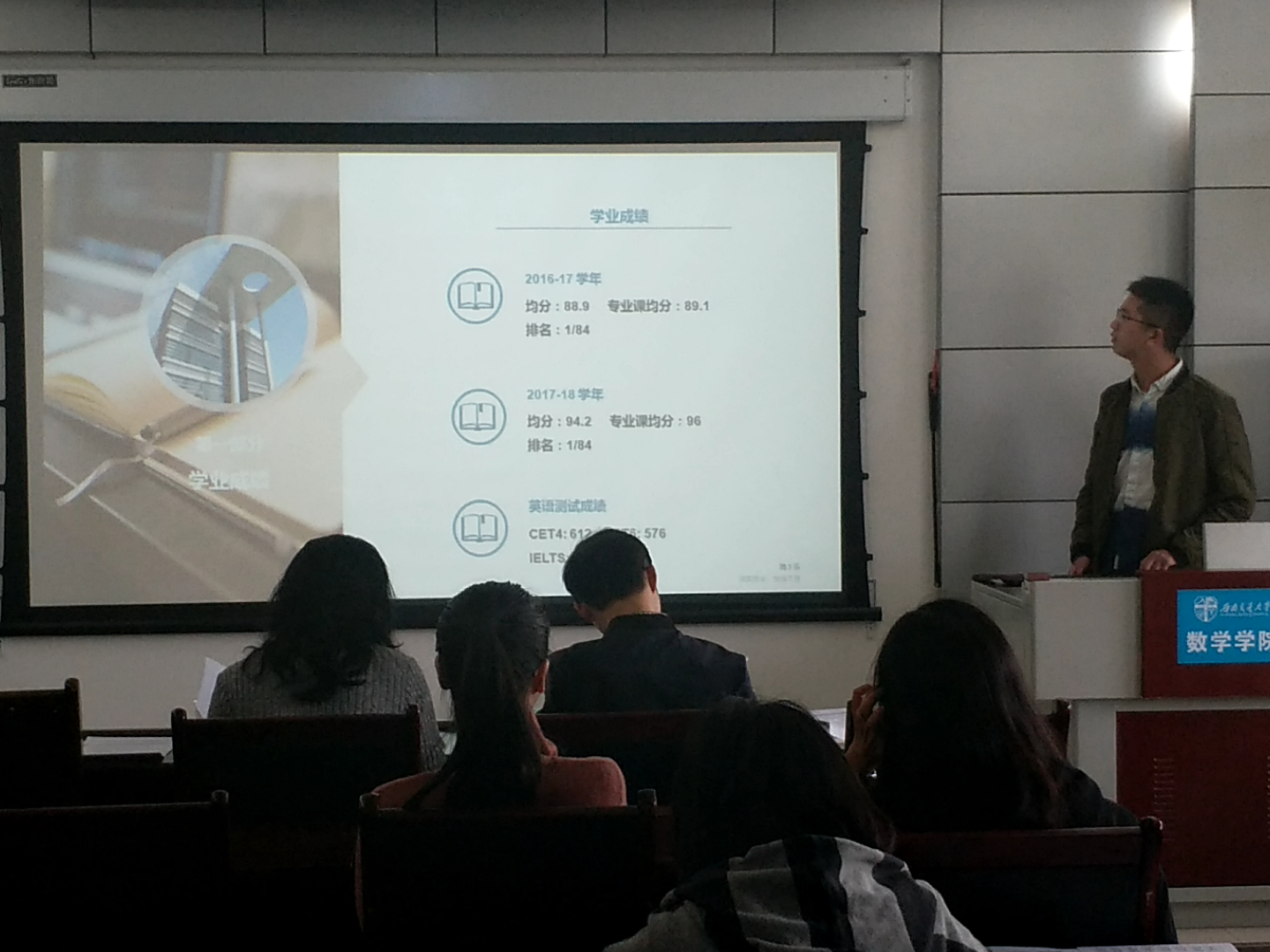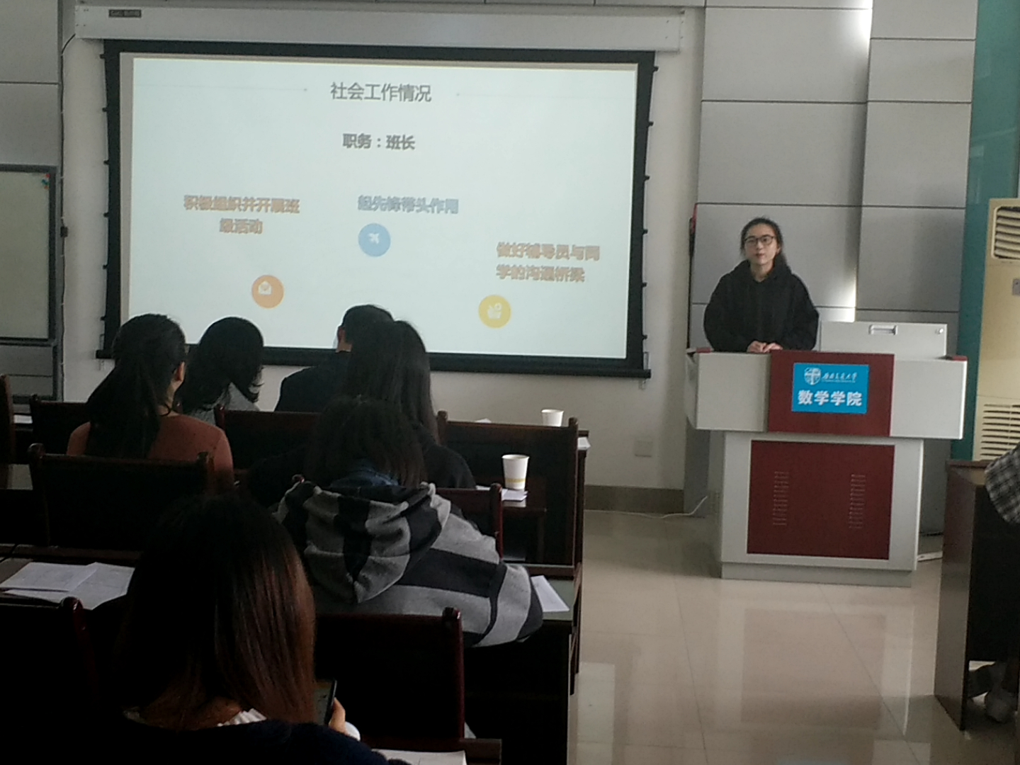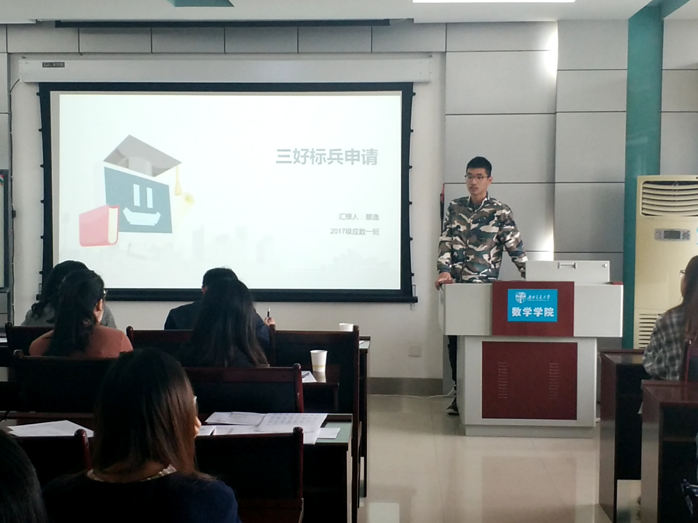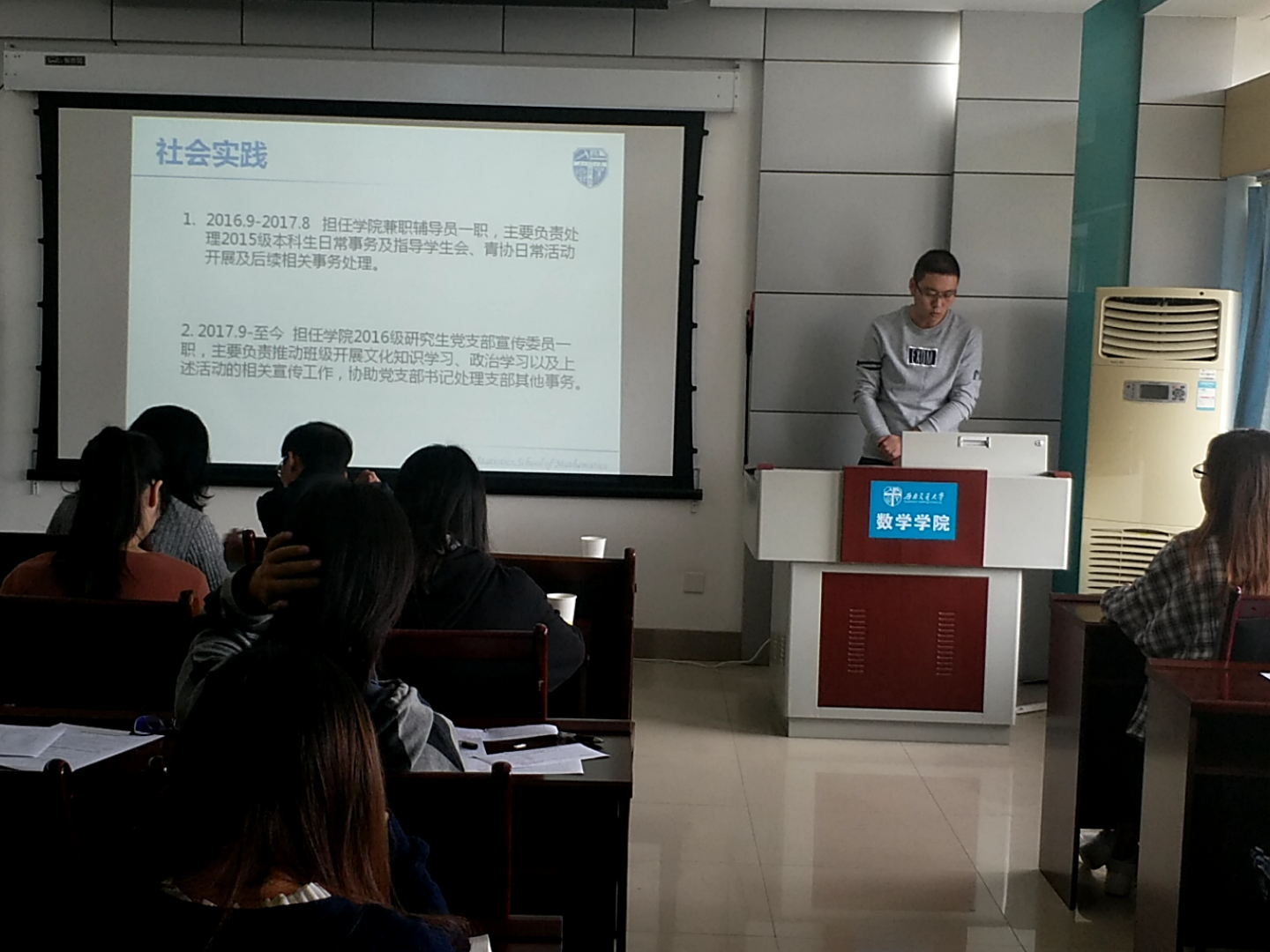 10月9号上午九点半,太阳集团tcy8722评奖评优答辩评选在X2511召开。担任答辩会的评委有数学公司党委书记徐革教授、党委副书记杨育鸿老师,公司团委书记邓思然老师,班导师代表程世娟、王中宝老师,辅导员代表钟义婷、谢童心老师以及本科生代表员工会主席祁元和研究生代表研会主席杨涵。