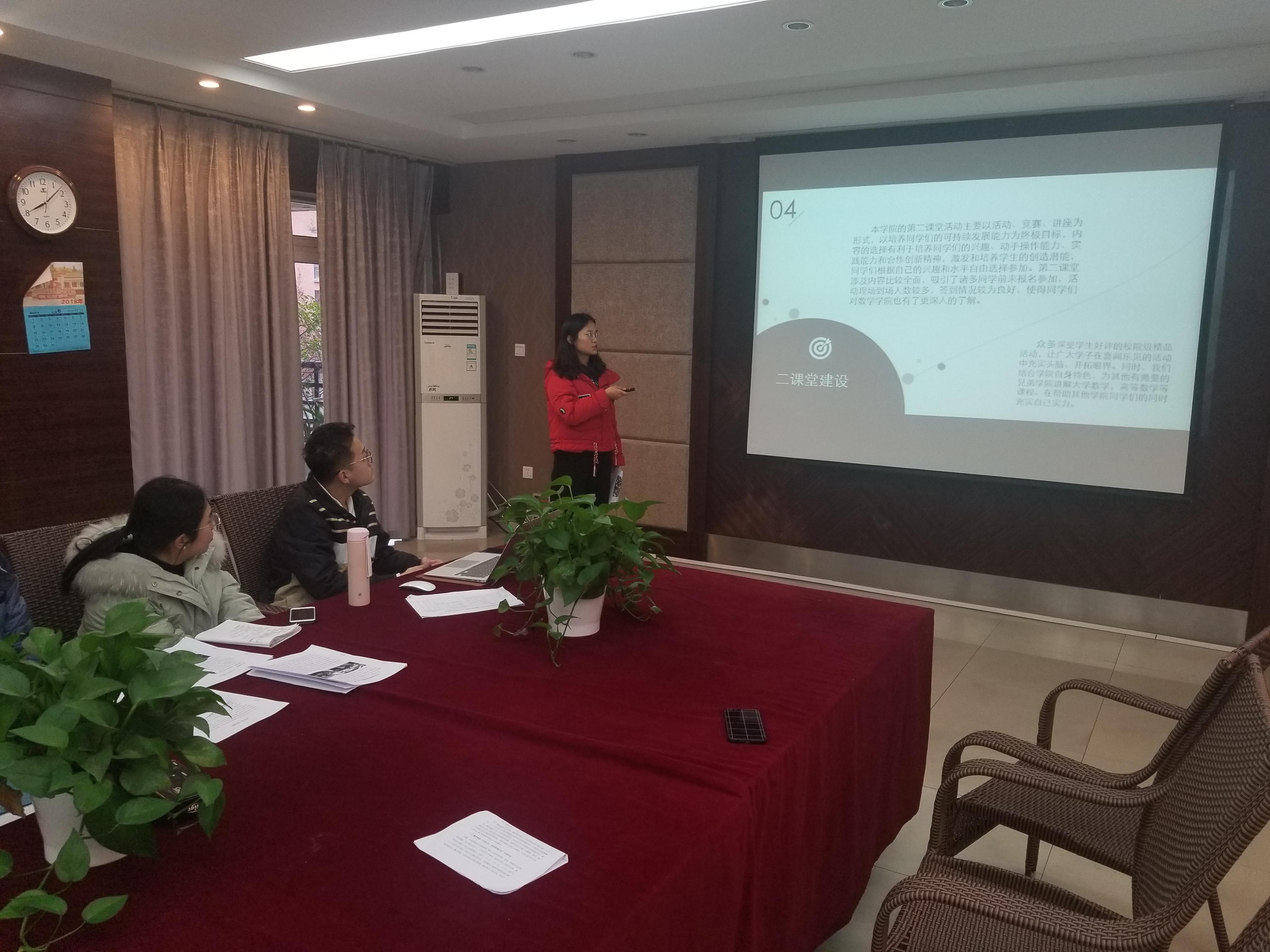 首先是新闻中心主席陈潭升进行介绍,他从四个部门的工作情况分别进行阐述,用图片和数据反映本年度新媒体的发展情况;接着是研究生会主席杨涵作报告,她向在场各位介绍了研究生会在学术和活动组织方面的一些重要成绩;随后是青年志愿者协会主席张红佳,她向与会人员成功讲述了青协在这一年中开展的多种多样的志愿者活动,对事件的描述很详细,展示了青协的优秀成果;最后是员工会主席温苗苗汇报员工会的年度工作,她首先从部门的具体概况和工作方向讲起,接着选取了几项重要工作,如第二课堂项目以及一些大型活动的组织进行了细致的汇报。